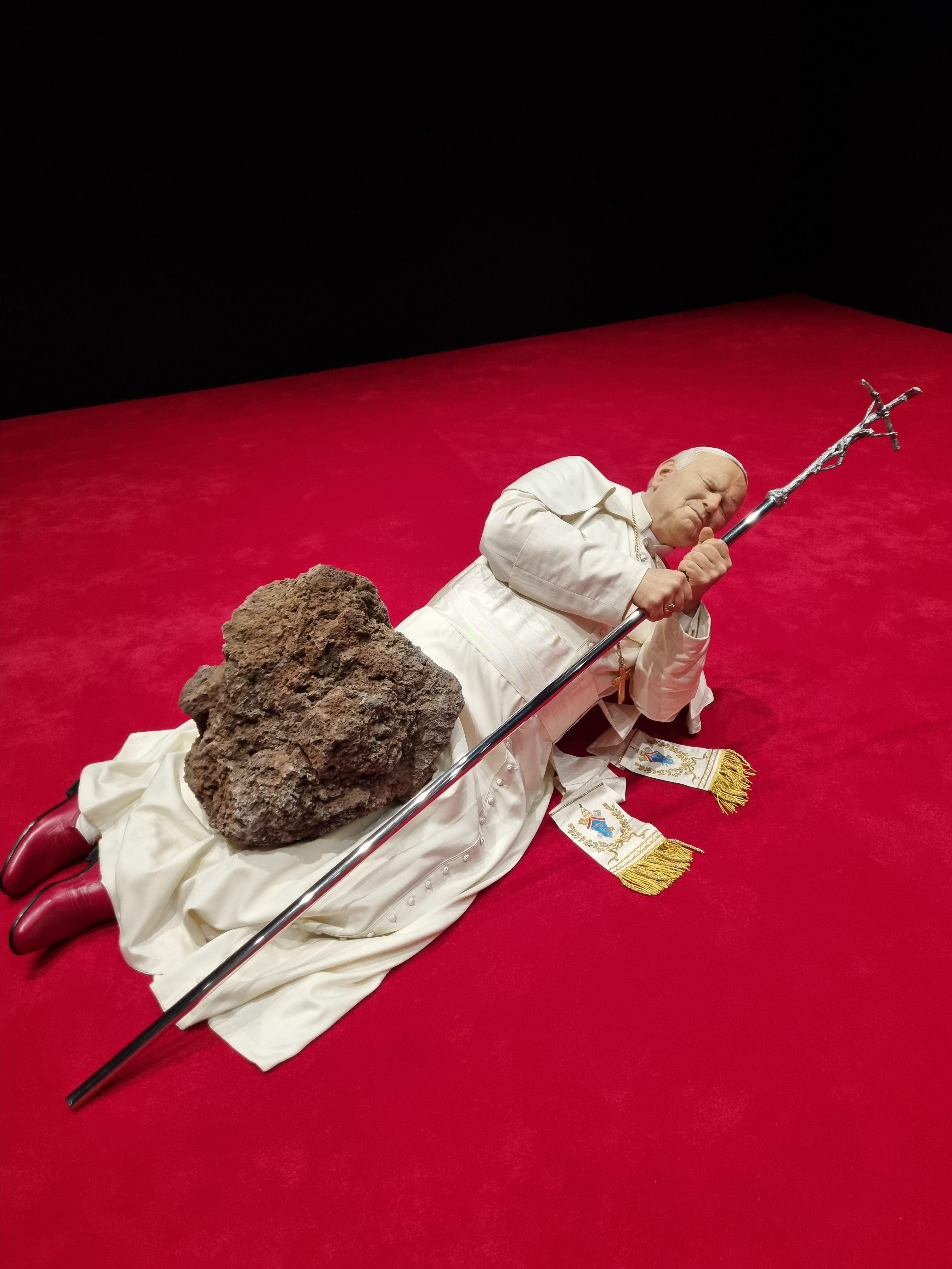 작품제작 당시 교황이었던 요한 바오르 2세가 운석에 맞아 쓰러진 것을 형상화했는데, 종교적 지도자이자 바티칸 시국의 원수인 교황에 대한 파격적인 설정을 적용한 모습은 카텔란이 권위를 다루는 태도를 보여줍니다.