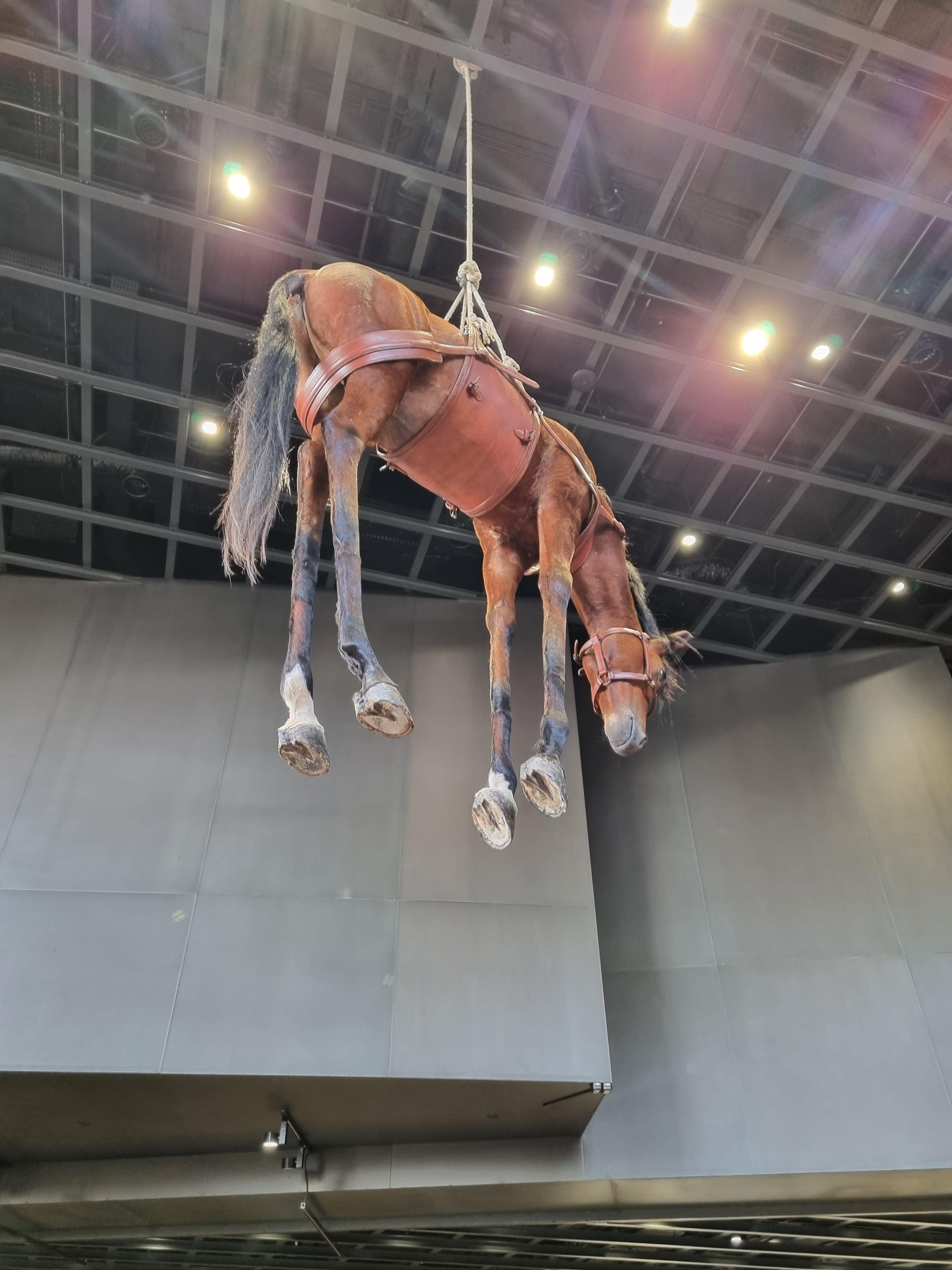 전시장 천장에 매달려있는 박제된 말 작품이 가장 먼저 눈에 띕니다.