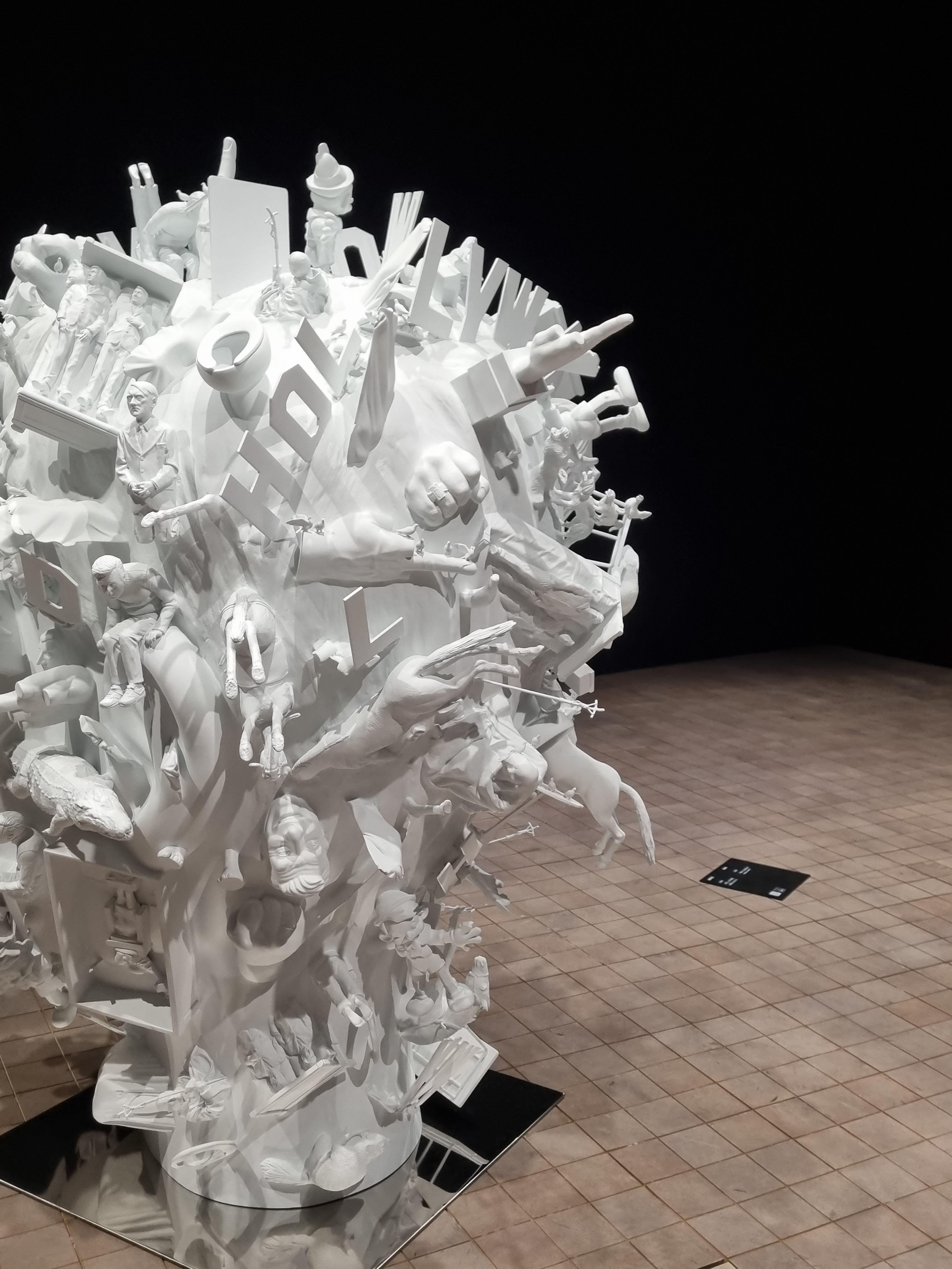 카텔란을 닮은 두상 조각에 자신의 모든 작품을 축소해 만든 작은 모형이 가득 붙어있는 작품에 빈 공간을 뜻하는 <Void>제목을 붙이는 역설.
