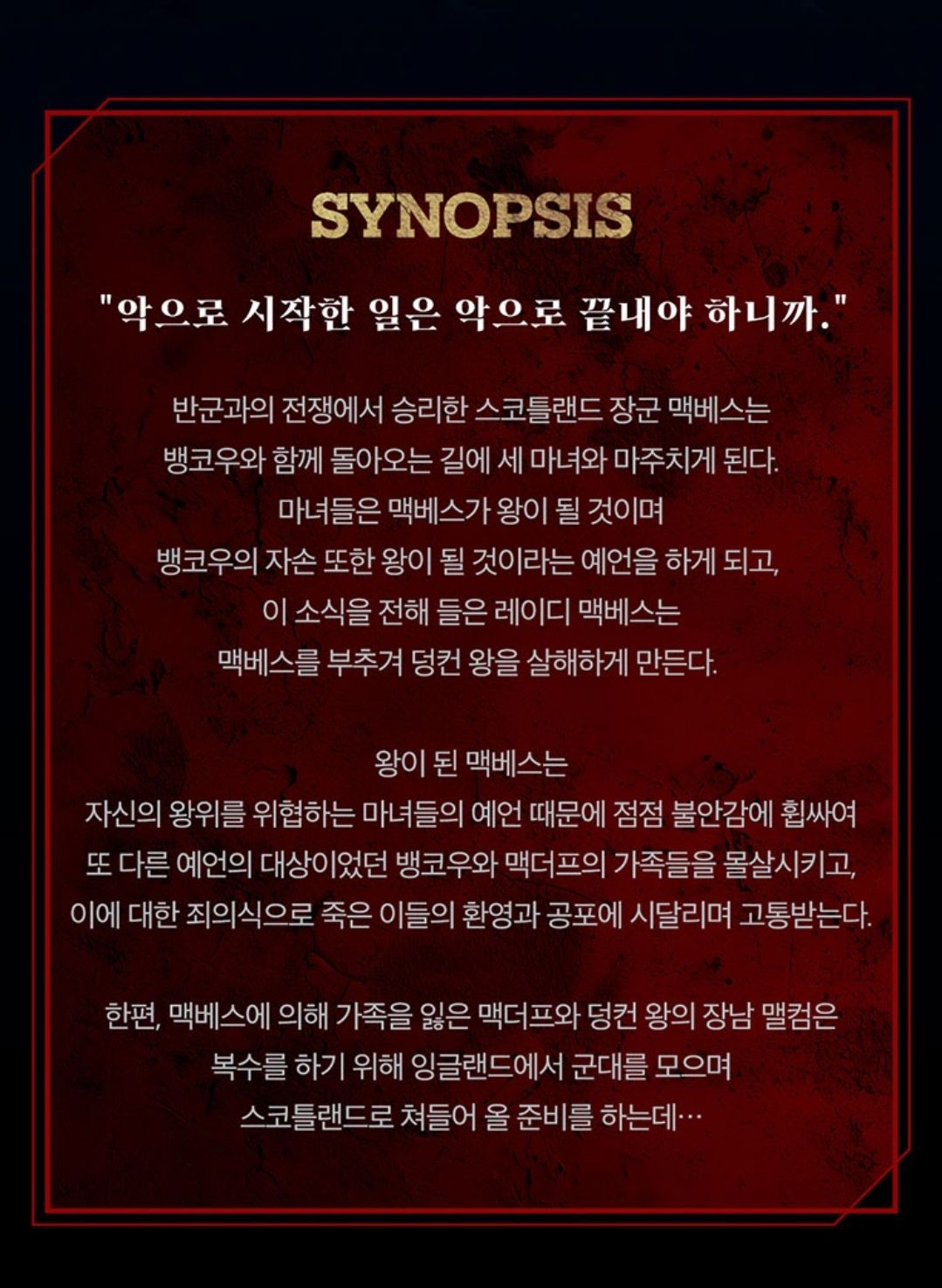 셰익스피어 4대 비극 중 하나인 '맥베스'는 스코틀랜드의 장군 맥베스가 왕이 될 것이라는 마녀의 예언을 듣고서 국왕을 살해하고 왕위에 오른 뒤 서서히 파멸해가는 이야기입니다.