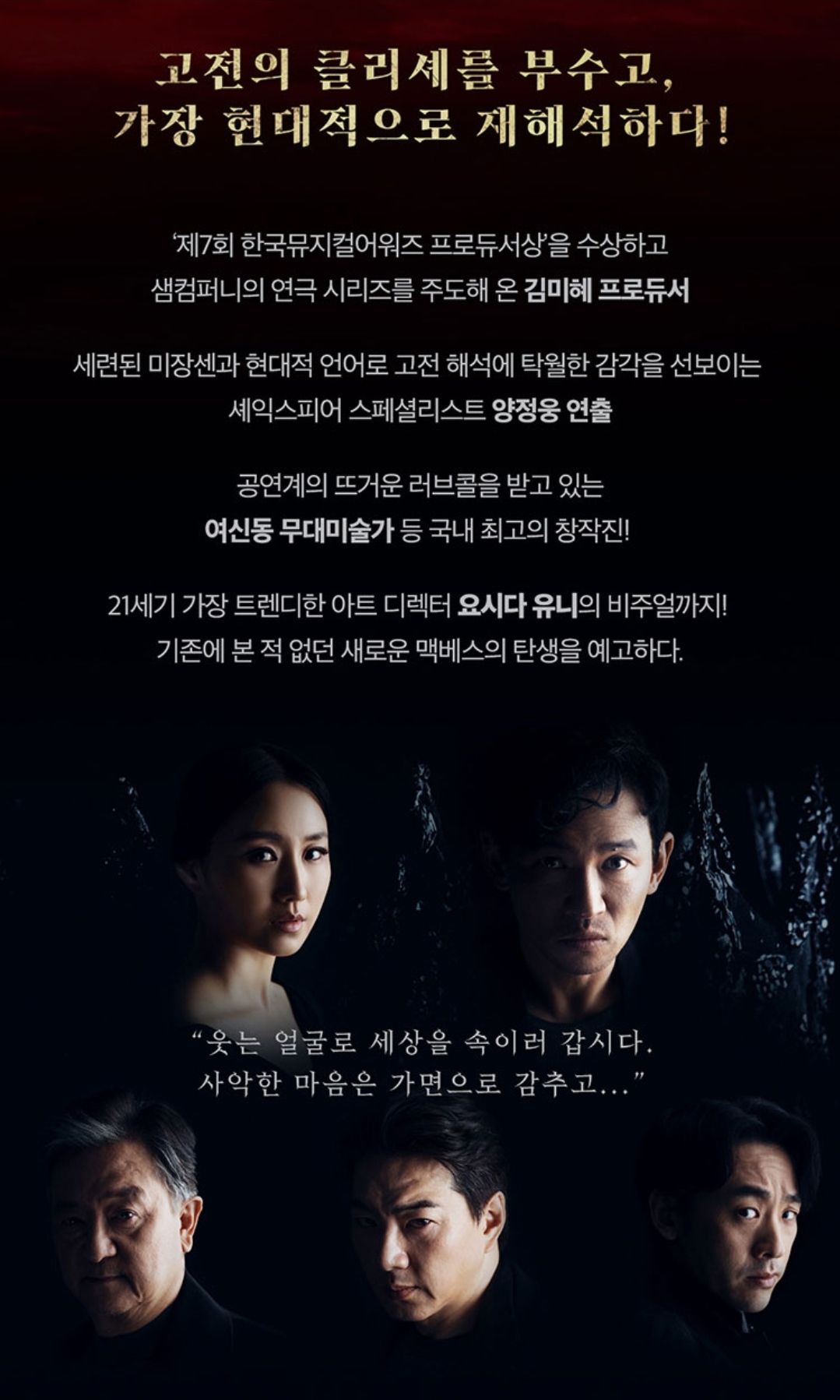 연출을 맡은 양정웅은 "헤어나올 수 없는 욕망에 손을 댄 이후 찾아오는 상실감과 죄책감을 잘 표현한 작품"이라고 맥베스를 소개했어요.