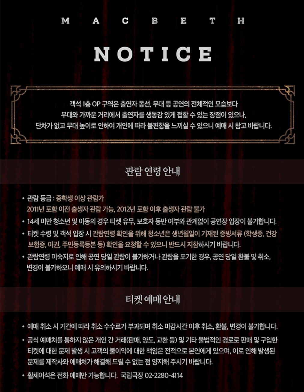 연극 맥베스 관람연령은 중학생이상 관람가이고 러닝타임은 120분입니다.