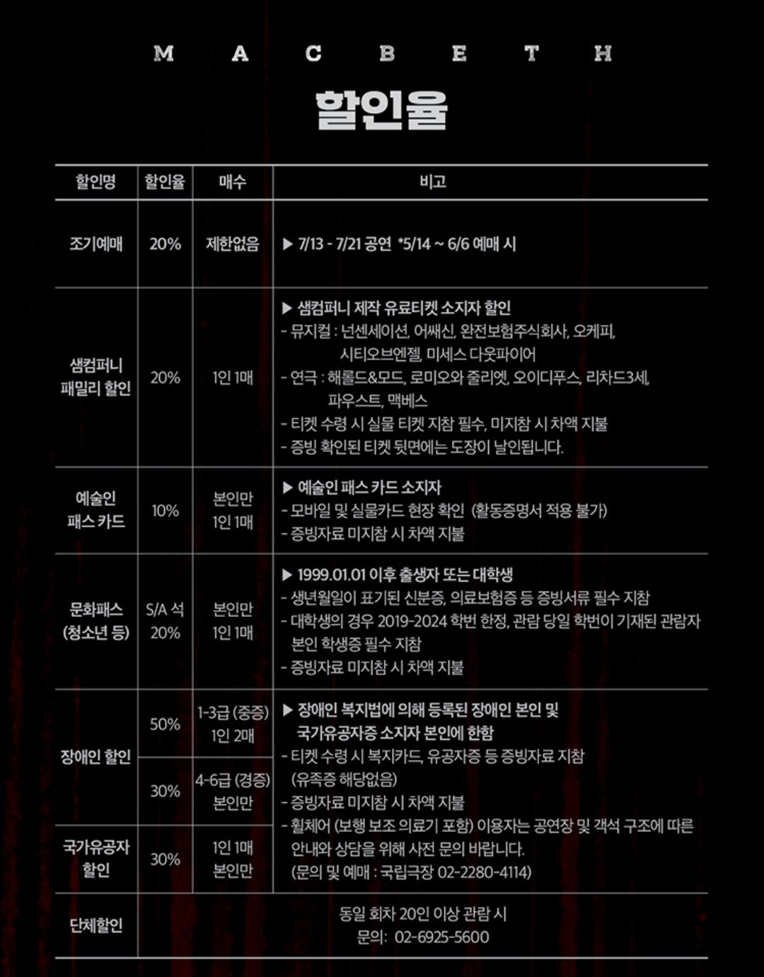 얼리버드예매 할인 20% 외에도 샘컴퍼니 패밀리 할인이나 청소년 문화패스 할인도 있습니다.