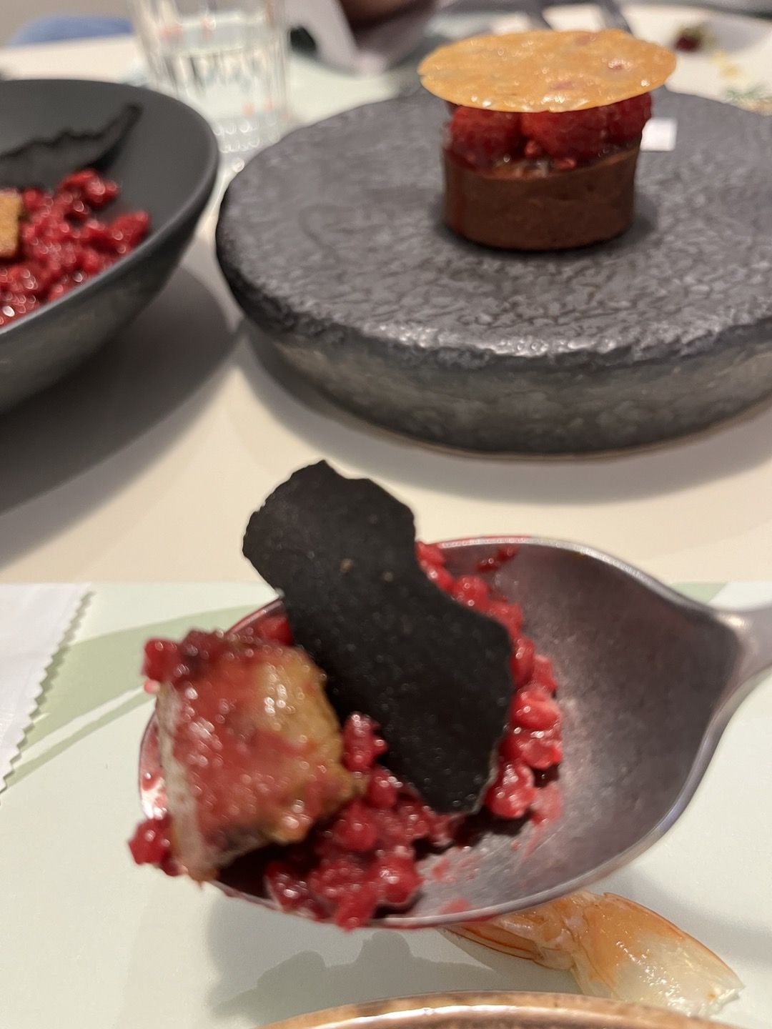 메인 요리인 <부인의 속삭임>은 야망을 숨긴채 맥베스의 뒤에서 악랄한 속내를 비치는 레이디 맥베스를 검은 튀일 속에 가려진 붉은 리조또로 표현한 요리입니다.