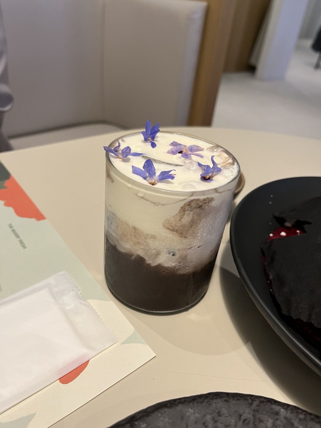 아래에 까만 코코아가 독이 퍼지는 느낌처럼 보여졌고 위에 장식된 보라색 꽃잎은 우아합니다.
