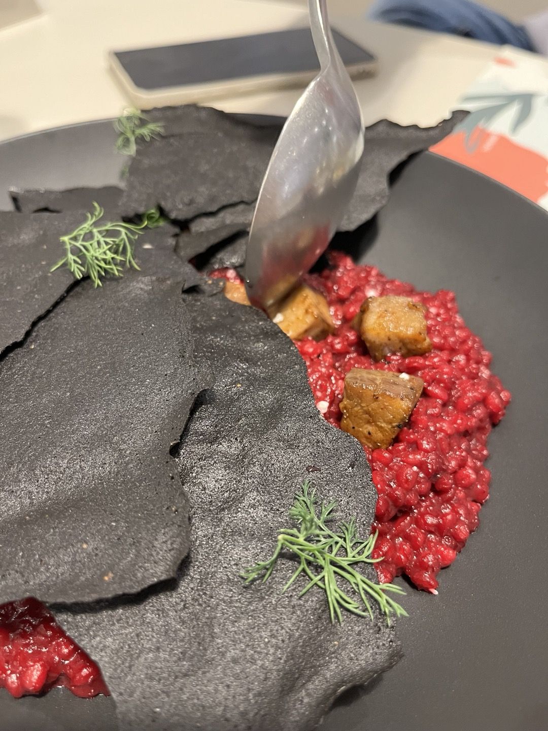 튀일아래에 이렇게 피색깔처럼 빨간 리조또와 돼지고기가 들어있어요.