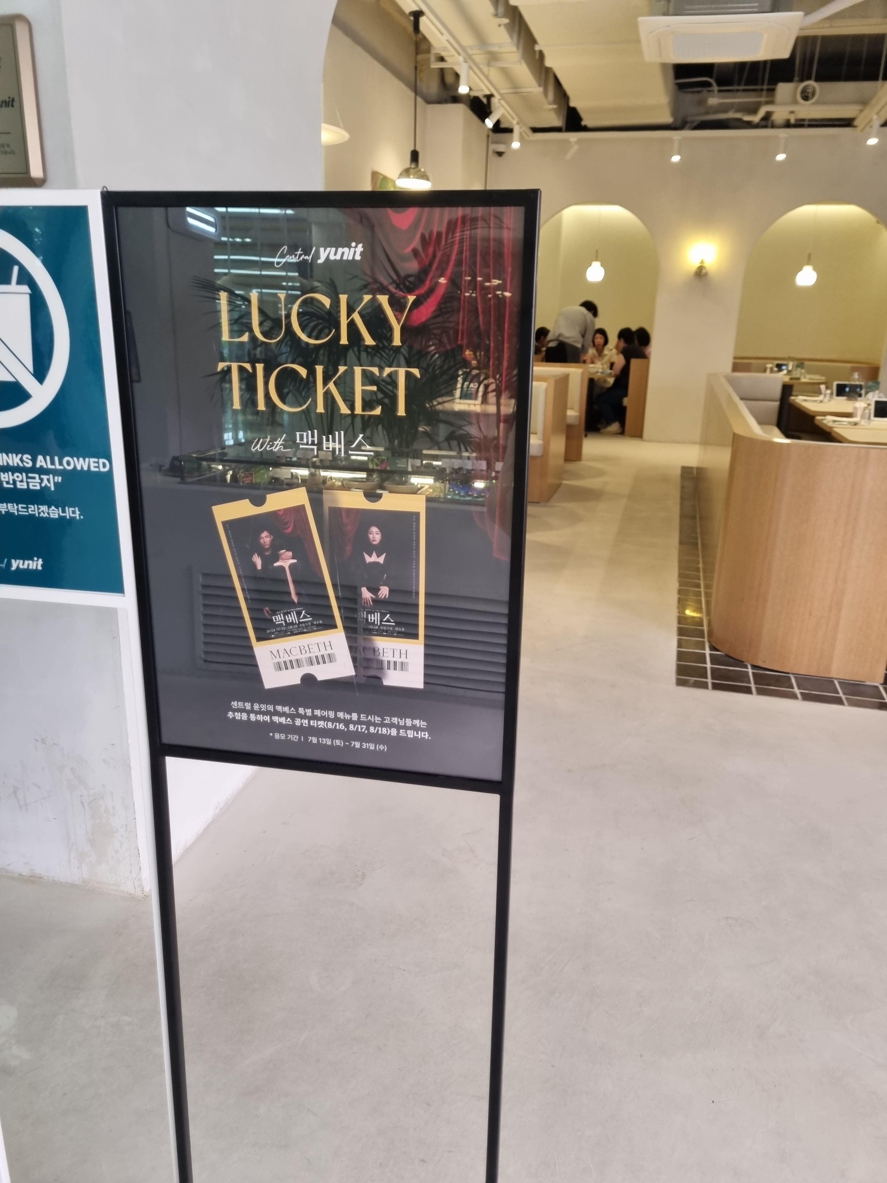 센트럴 윤잇의 맥베스 특별 페어링 메뉴를 드시는 고객들에게는 추첨을 통해 맥베스 공연 티켓을 선물로 드리는 이벤트도 하고 있었어요.