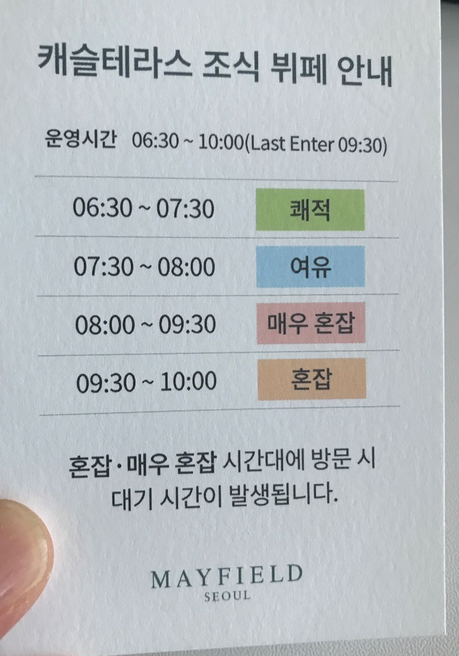 호텔에서 명함크기로 된 조식뷔페 안내장을 주시는데요, 시간마다 뷔페의 혼잡도가 적혀있어서 알기 쉬웠습니다.