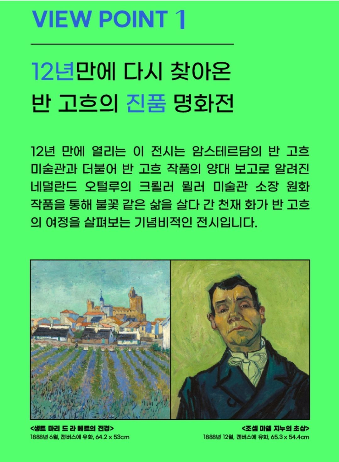 12년 만에 열리는 이번 전시는 암스테르담의 반 고흐미술관과 더불어 네덜란드 오털루의 크륄러 뮐러 미술관 소장 원화 작품을 통해 불꽃같은 삶을 살다가 천재 화가 반 고흐의 여정을 살펴보는 전시입니다.