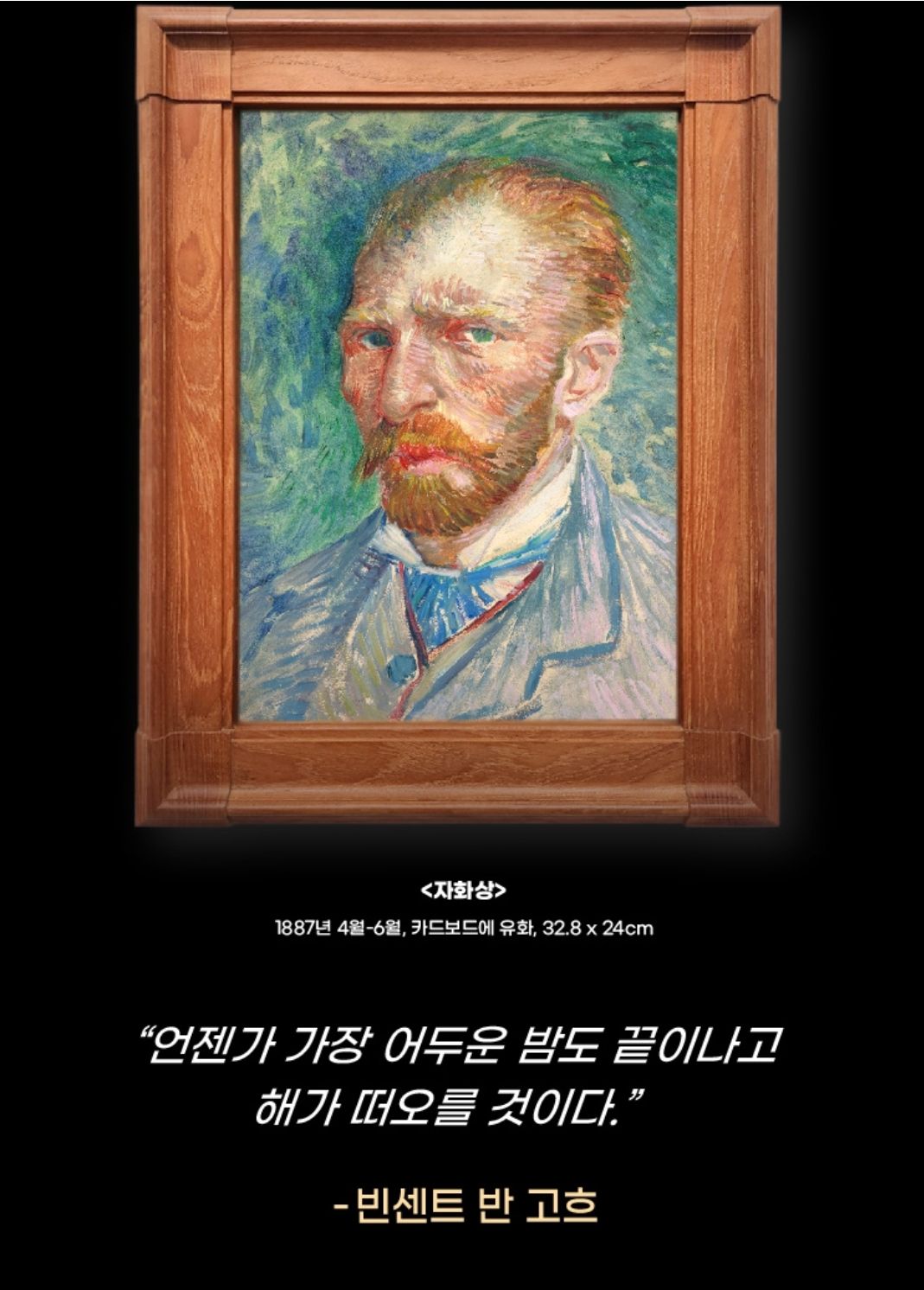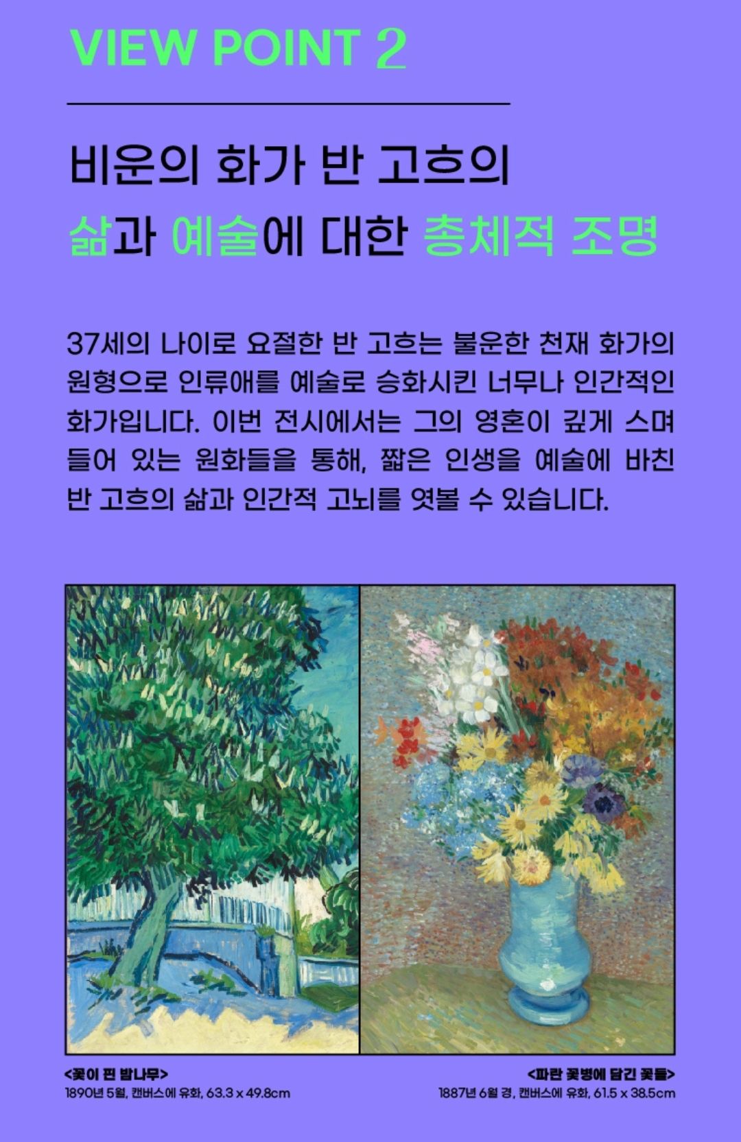 강렬한 색과 붓터치가 살아있는 명화를 통해 막 작업이 끝난듯한 반 고흐의 불꽃 같은 예술혼을 느껴보실 수 있다고 해요.