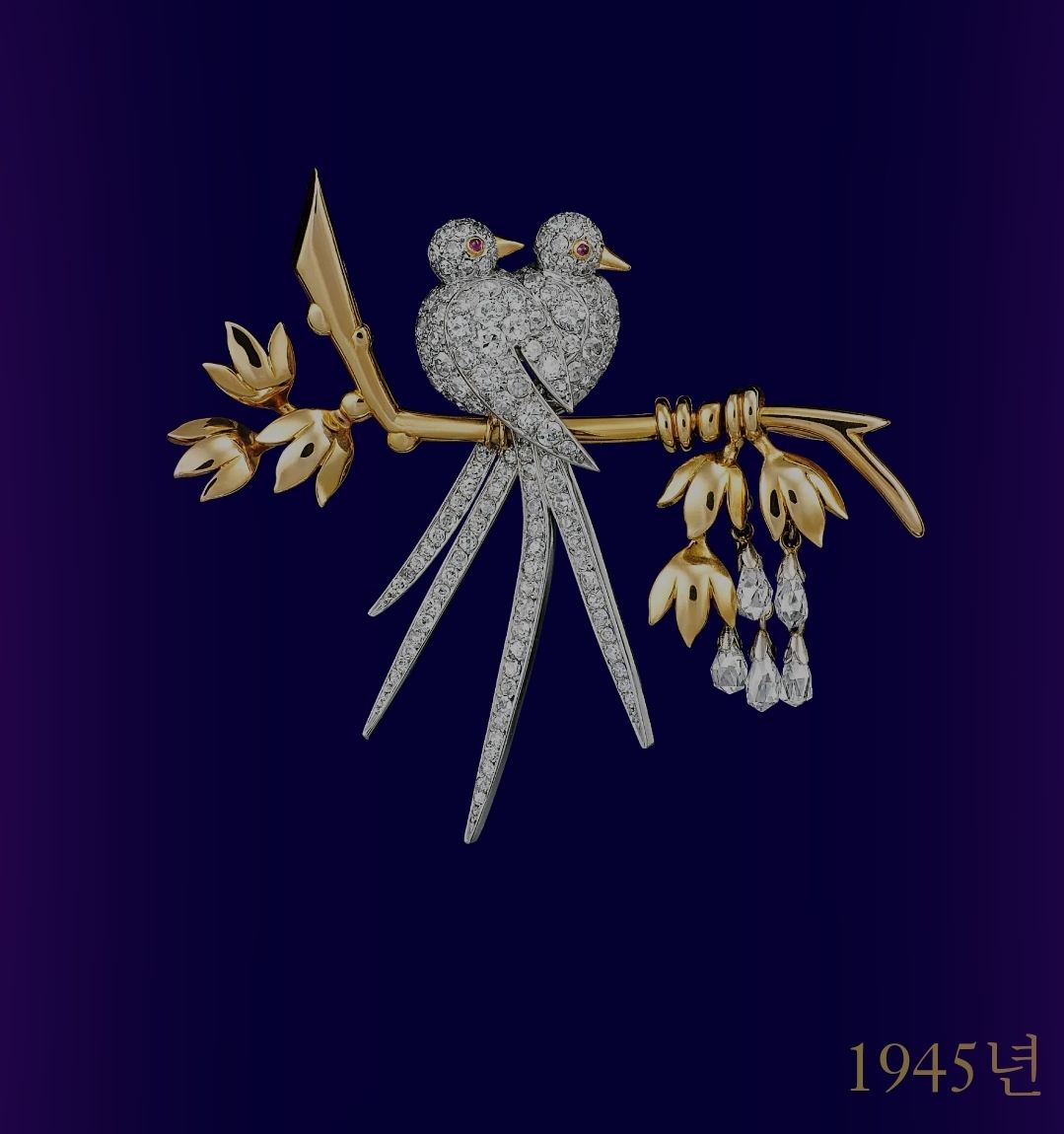 1945년에 제작된 이 브로치는 다이아몬드로 구현된 두 마리의 새가 다이아몬드 꽃이 피는 옐로우 골드의 나뭇가지에 앉아있습니다.