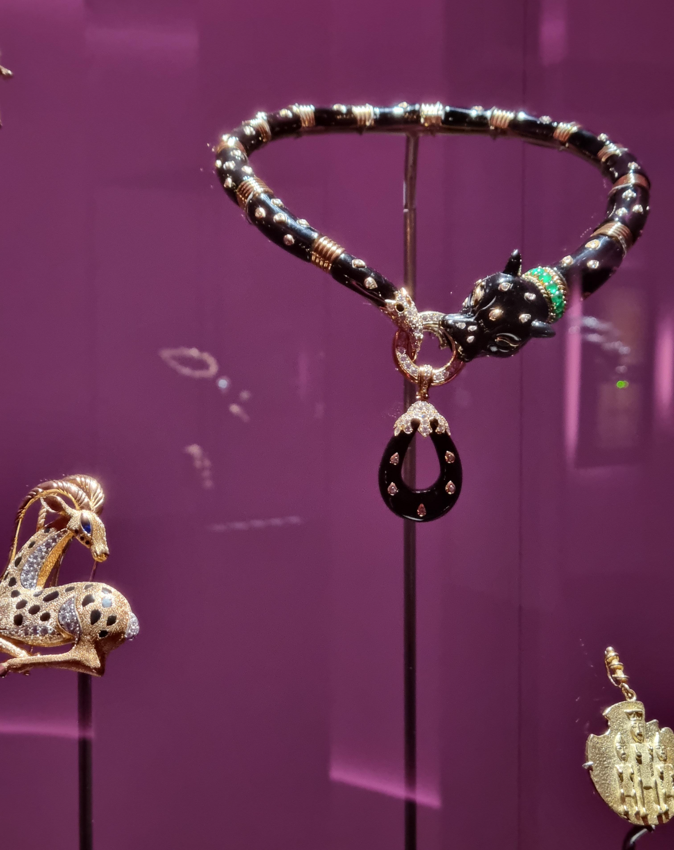 에메랄드 목걸이를 한 표범의 몸체는 오닉스이고 표범의 반점은 클로즈드 세팅 다이아몬드 장식으로, 유연성이 돋보이는 네크리스.