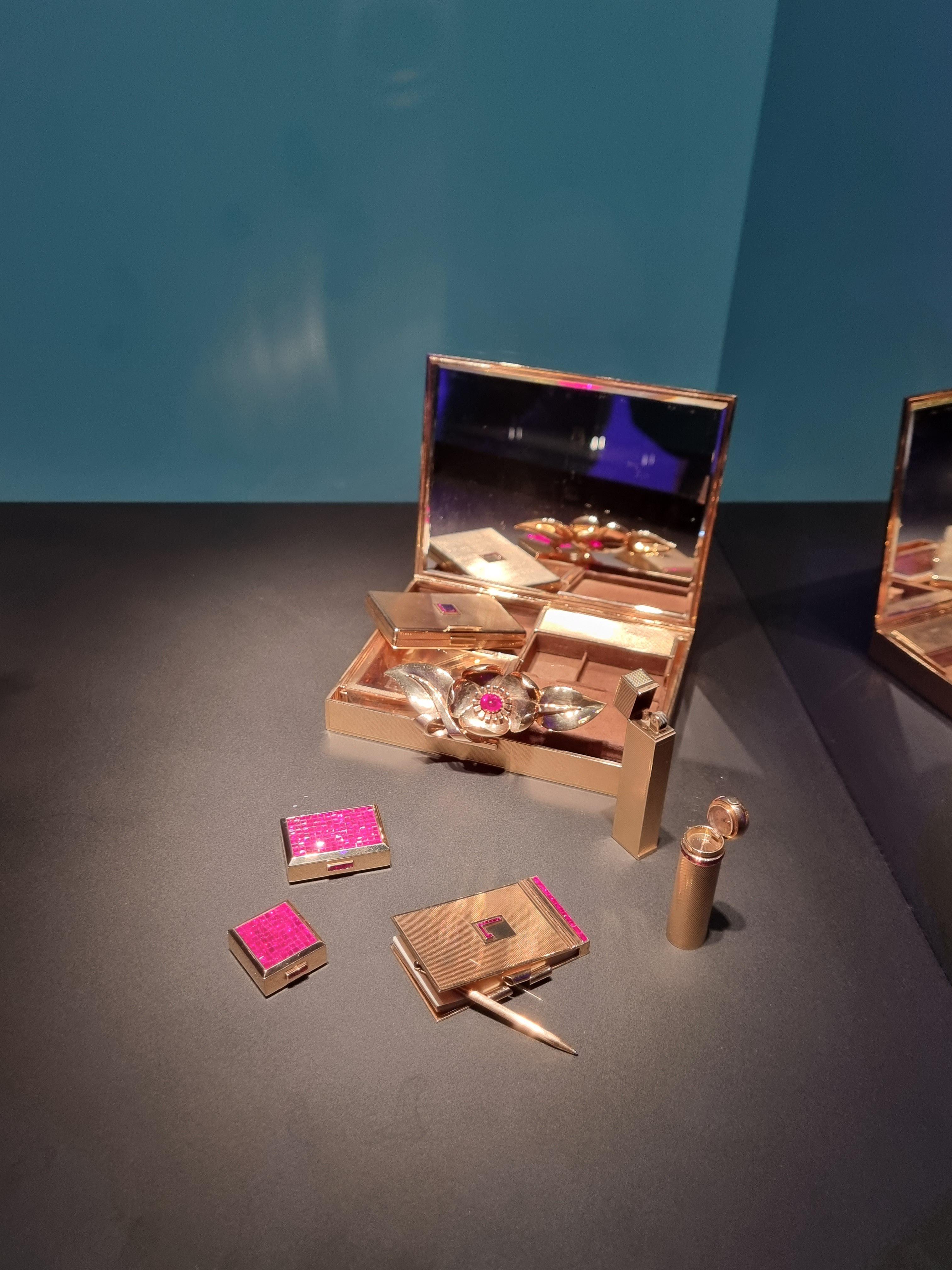 여기에는 파우더 컴팩트, 미스테리세팅의 루비 박스 2개, 상단에 워치가 부착된 립스틱, 댄스 카드, 라이터, 빗이 들어있어요.