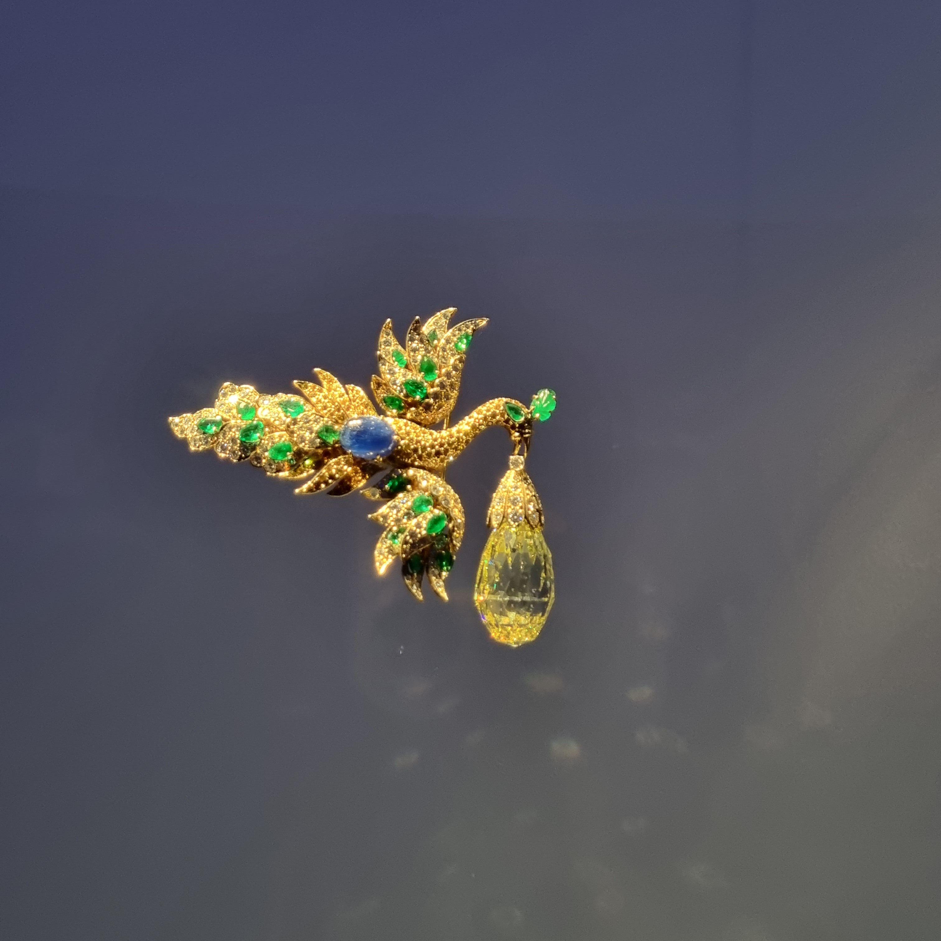 96.62캐럿의 페어 컷 옐로우 다이아몬드와 함께 날고 있는 새.