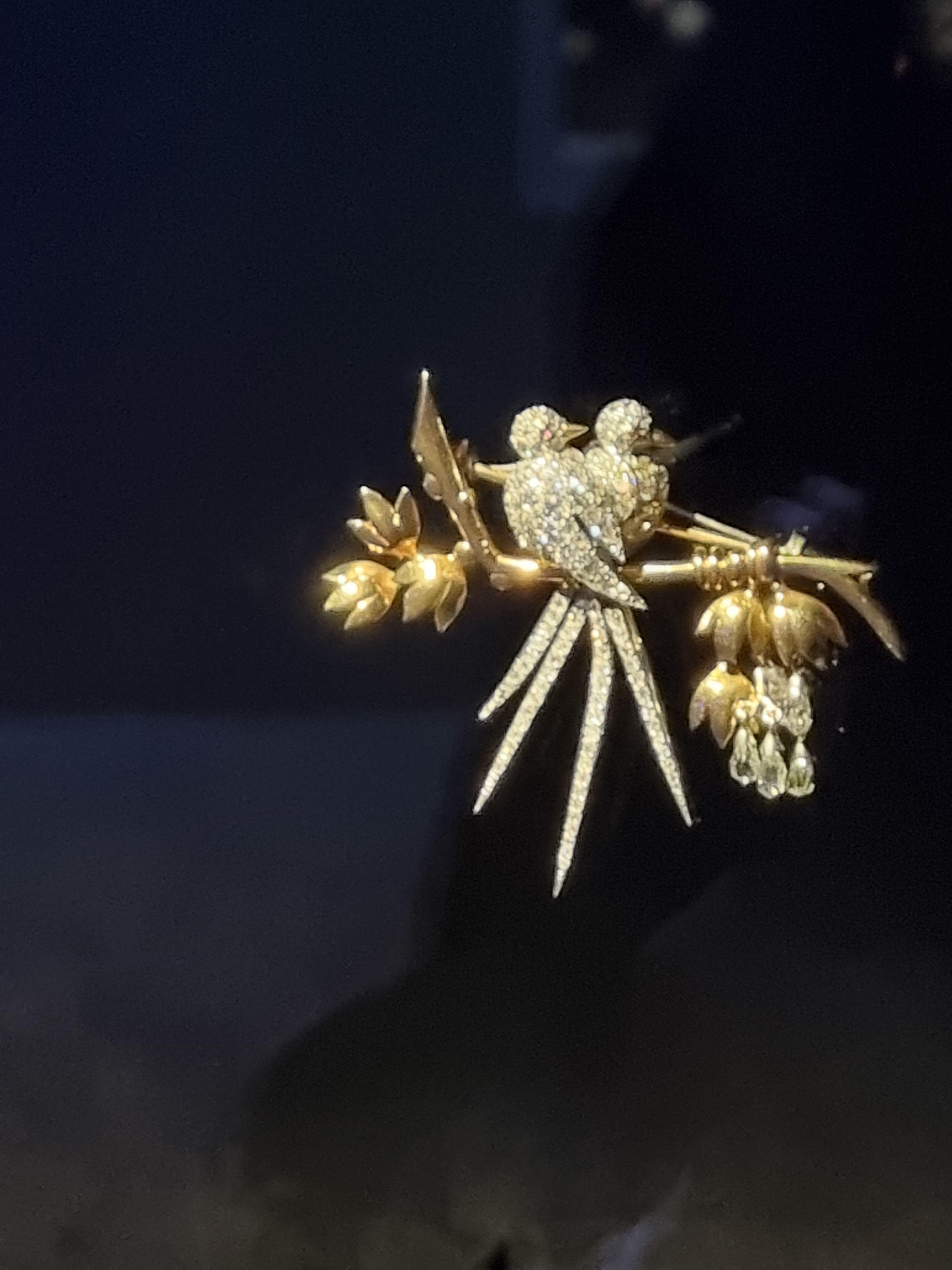 1945년에 제작된 이 브로치는 다이아몬드로 구현된 두 마리의 새가 다이아몬드 꽃이 피는 옐로우 골드의 나뭇가지에 앉아있습니다.