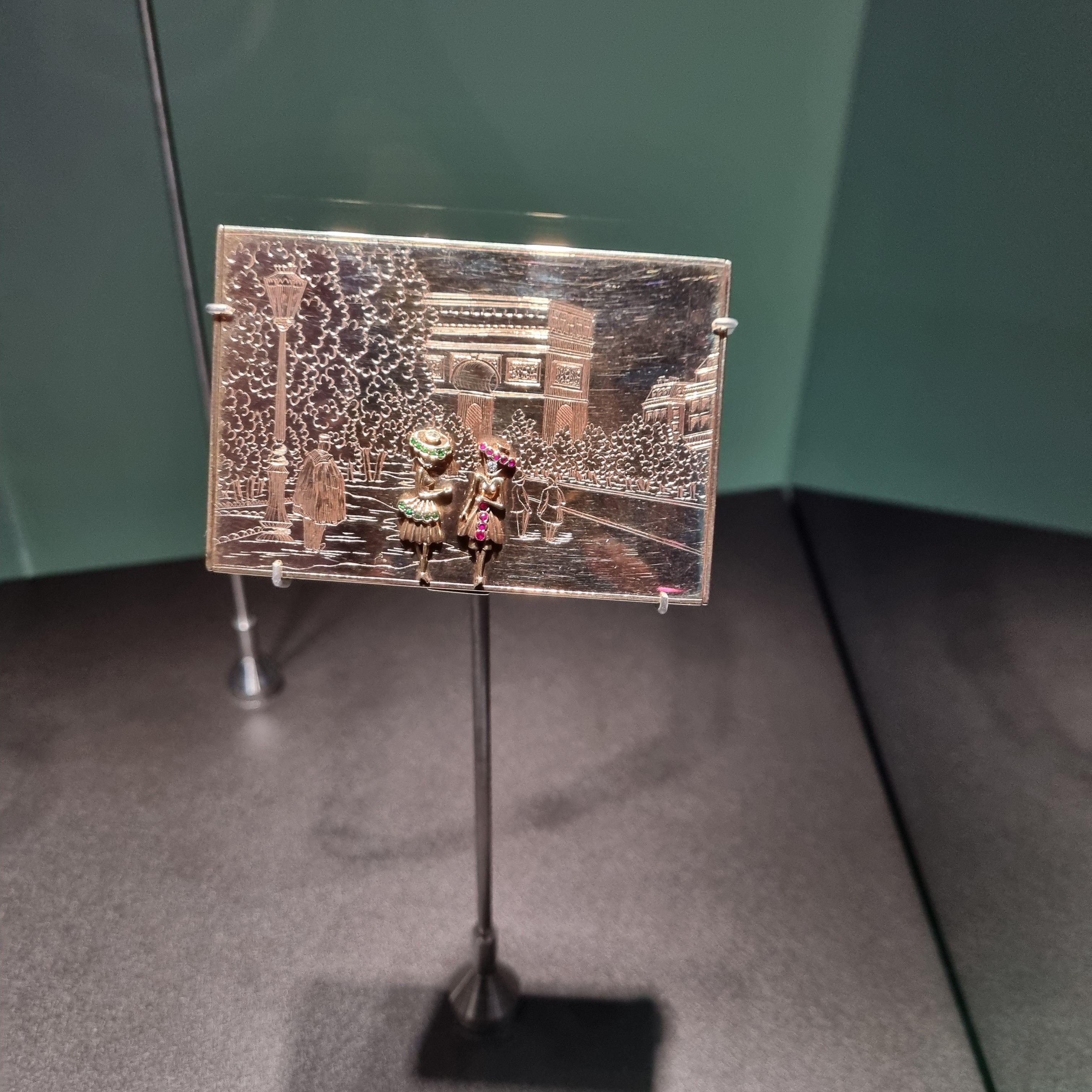 파리의 상징적인 장소인 개선문 거리를 따라 걷는 인물을 양각으로 새긴 파우더 케이스.