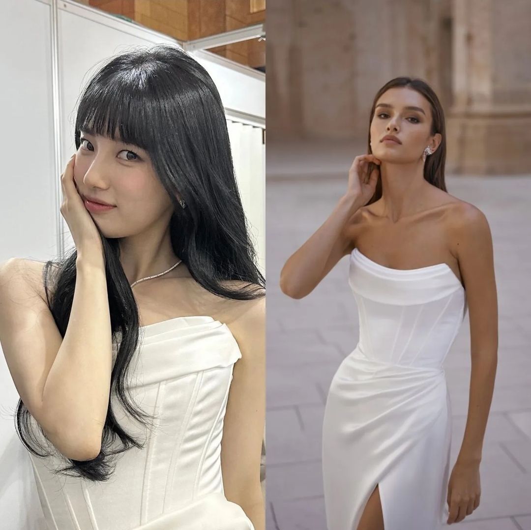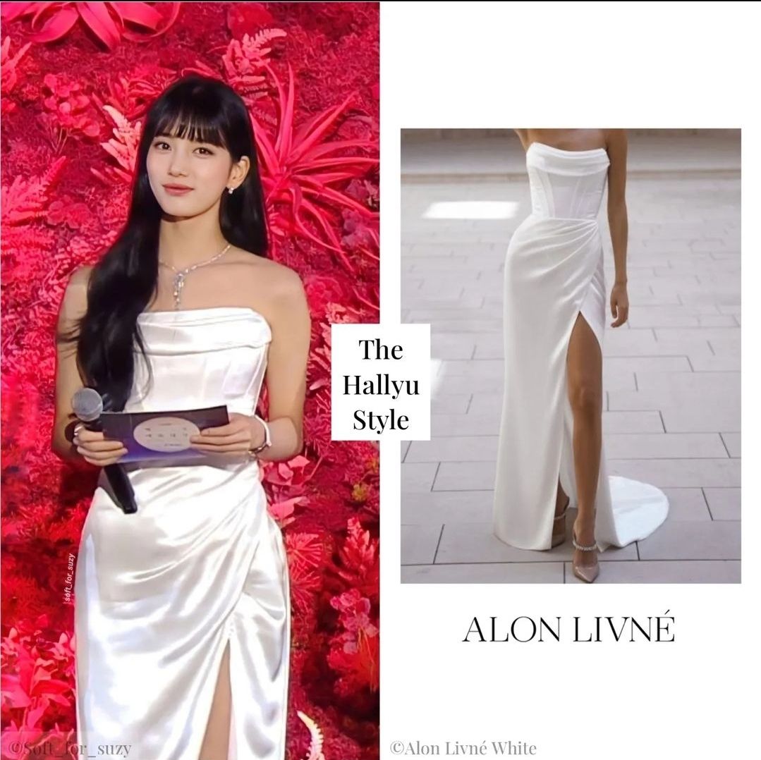 원래 디자인은 상의가 시스루로 되어있는데 수지가 입은 드레스는 살짝 변형한 것 같습니다.