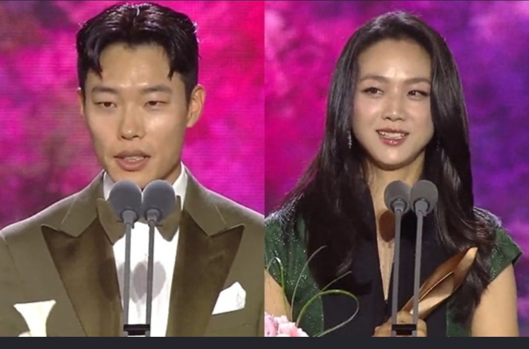 백상예술대상에서 영화부문 최우수 연기상을 받은 류준열(올빼미)과 탕웨이(헤어질 결심).