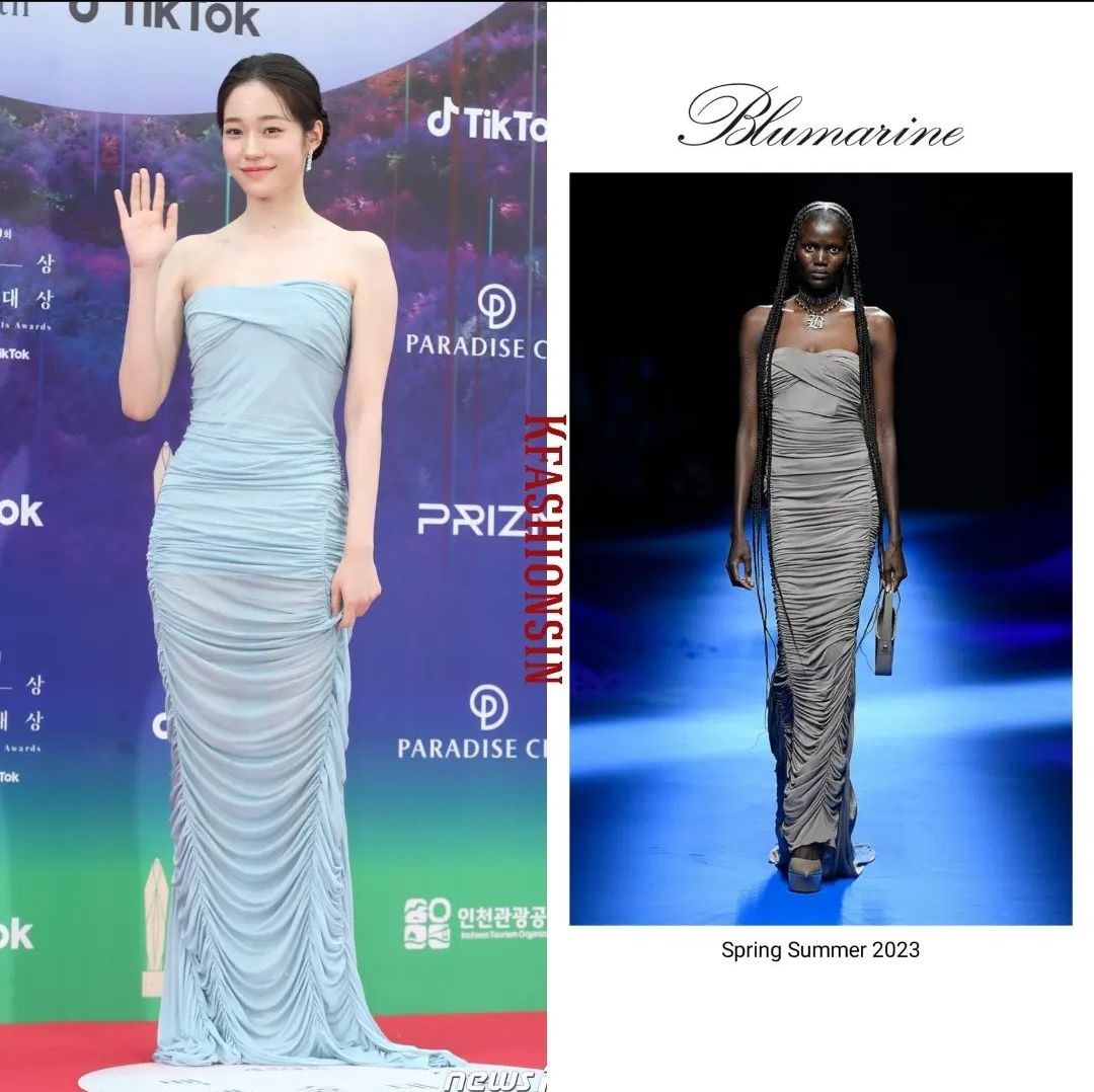 '일타스캔들' 로 신인상을 수상한 노윤서 배우의 드레스는 여리여리한 하늘색으로 브랜드는 블루마린입니다.