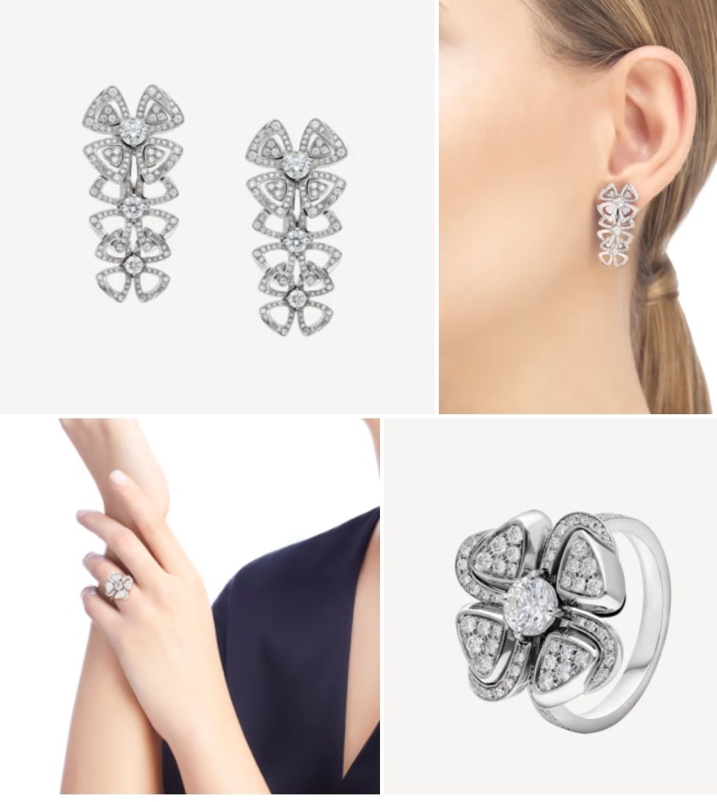 그녀가 착용한 이어링과 반지는 불가리 제품으로, 네 개의 꽃잎을 지닌 매혹적인 꽃에서 영감을 받은 피오레버 모델이며, 18K화이트 골드 꽃잎과 다이아몬드 파베 세팅으로 우아하면서 화려한 디자인입니다.