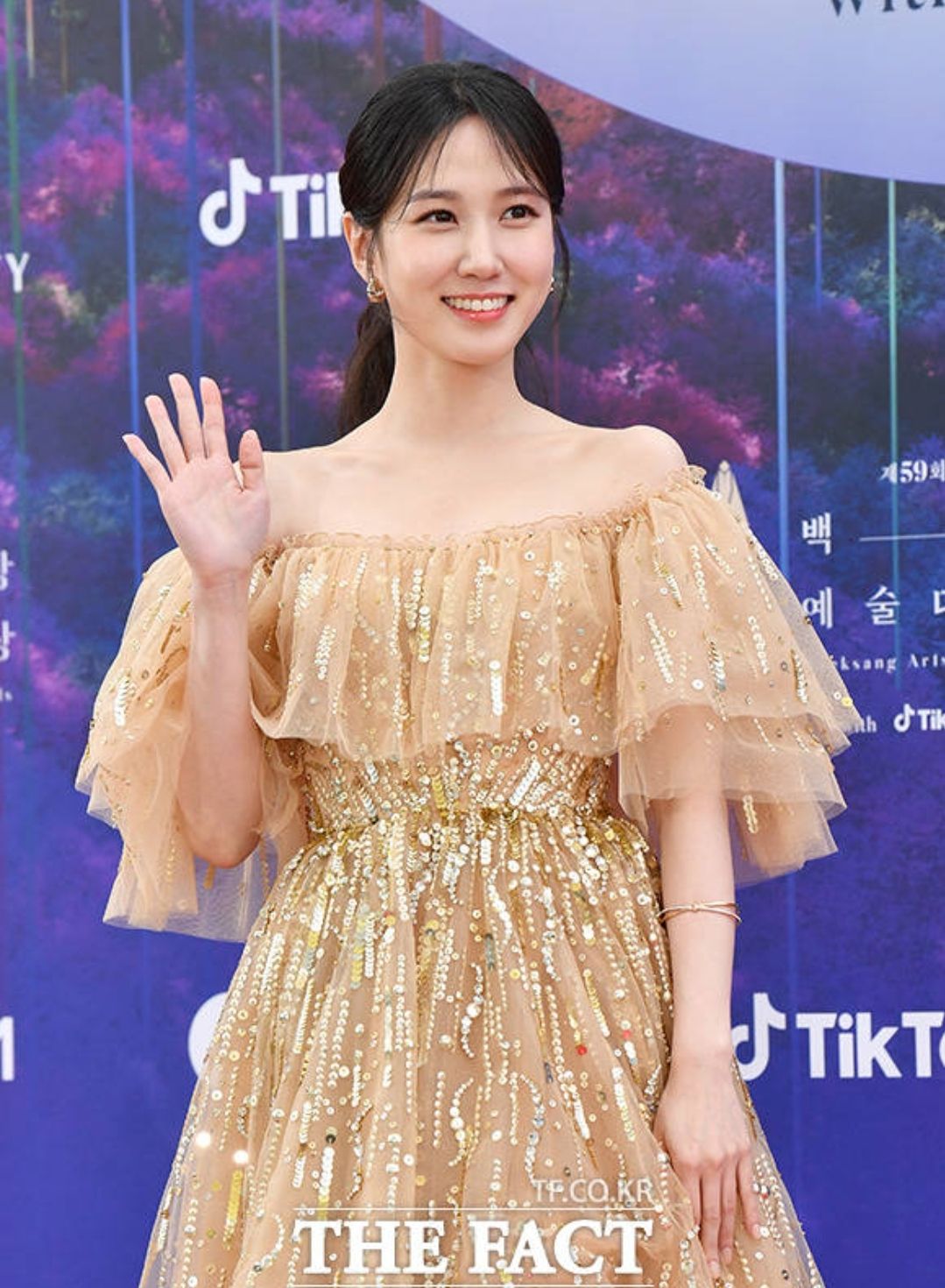 레드카펫에서 블링블링한 골드빛 드레스는 그녀의 맑은 느낌과 잘 어울렸습니다.