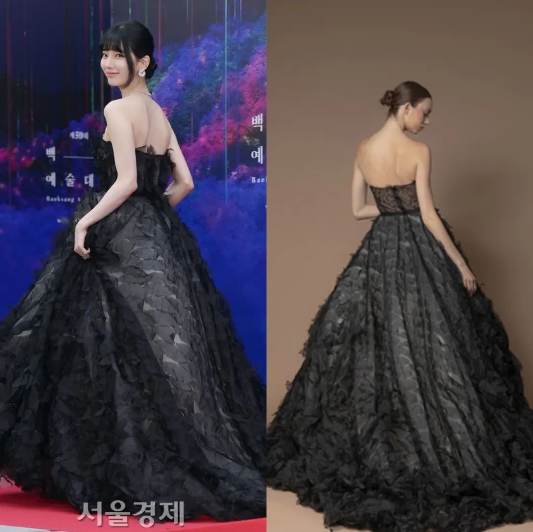 원래 디자인은 상의가 시스루로 되어있는데 수지가 입은 드레스는 살짝 변형한 것 같습니다.
