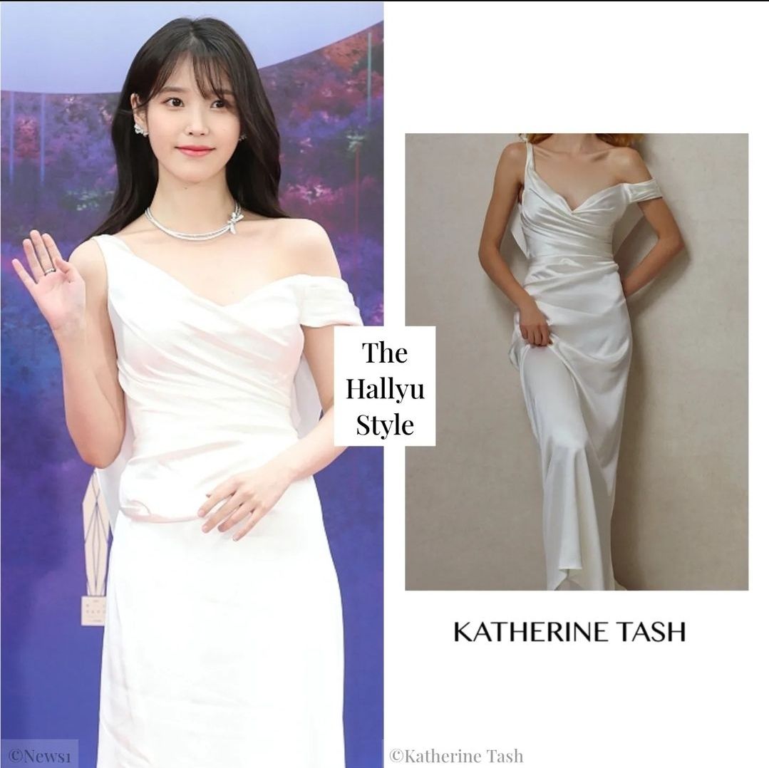 아이유는 양쪽 소매가 다른 유니크한 화이트 새틴 드레스를 착용했고 목걸이로 포인트를 주었는데,