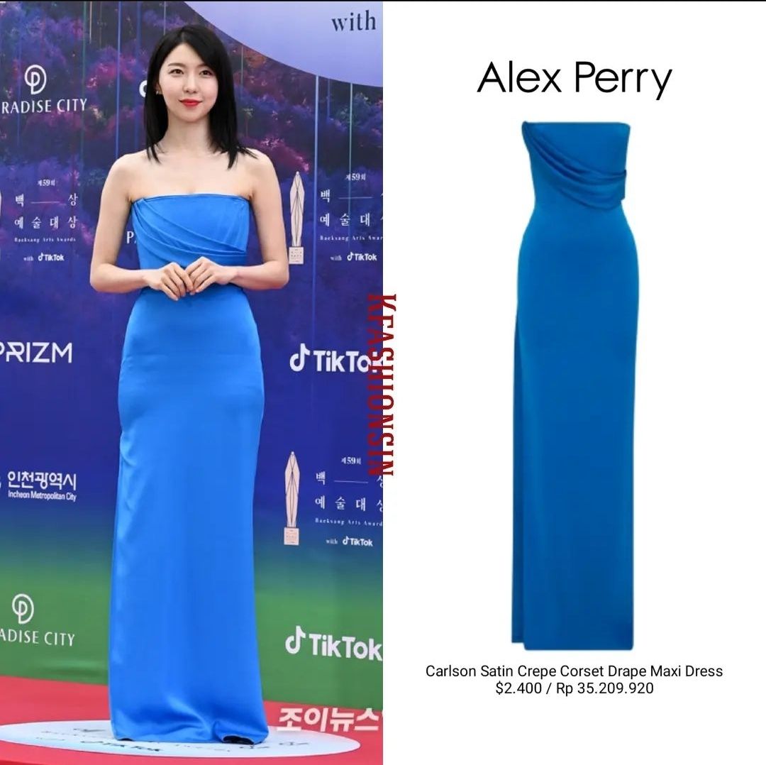 김지원이 레드카펫에 착용한 드레스 브랜드는 '코스타렐로스'이고 노출이 없는 디자인이라 더 단아해보입니다.