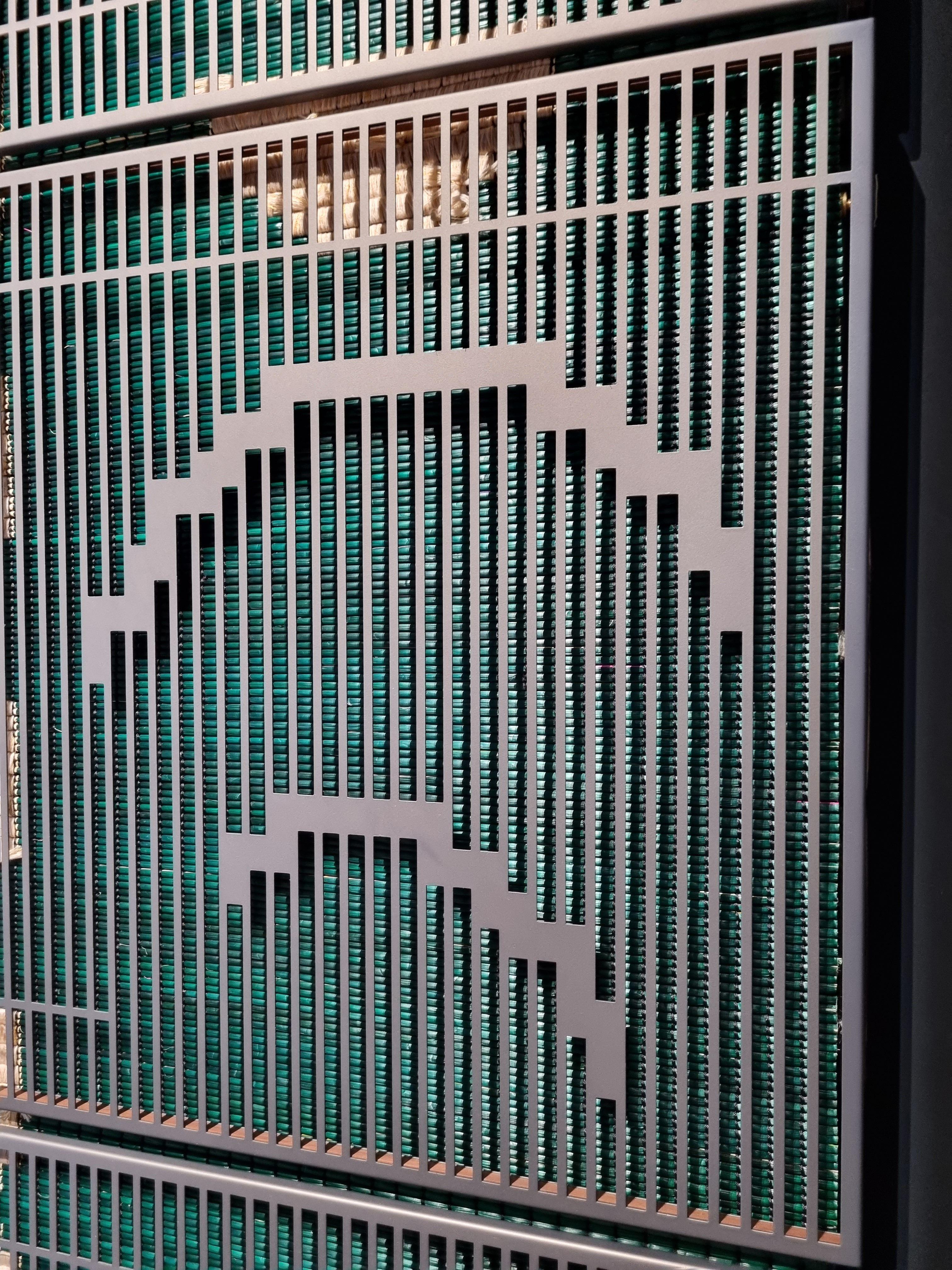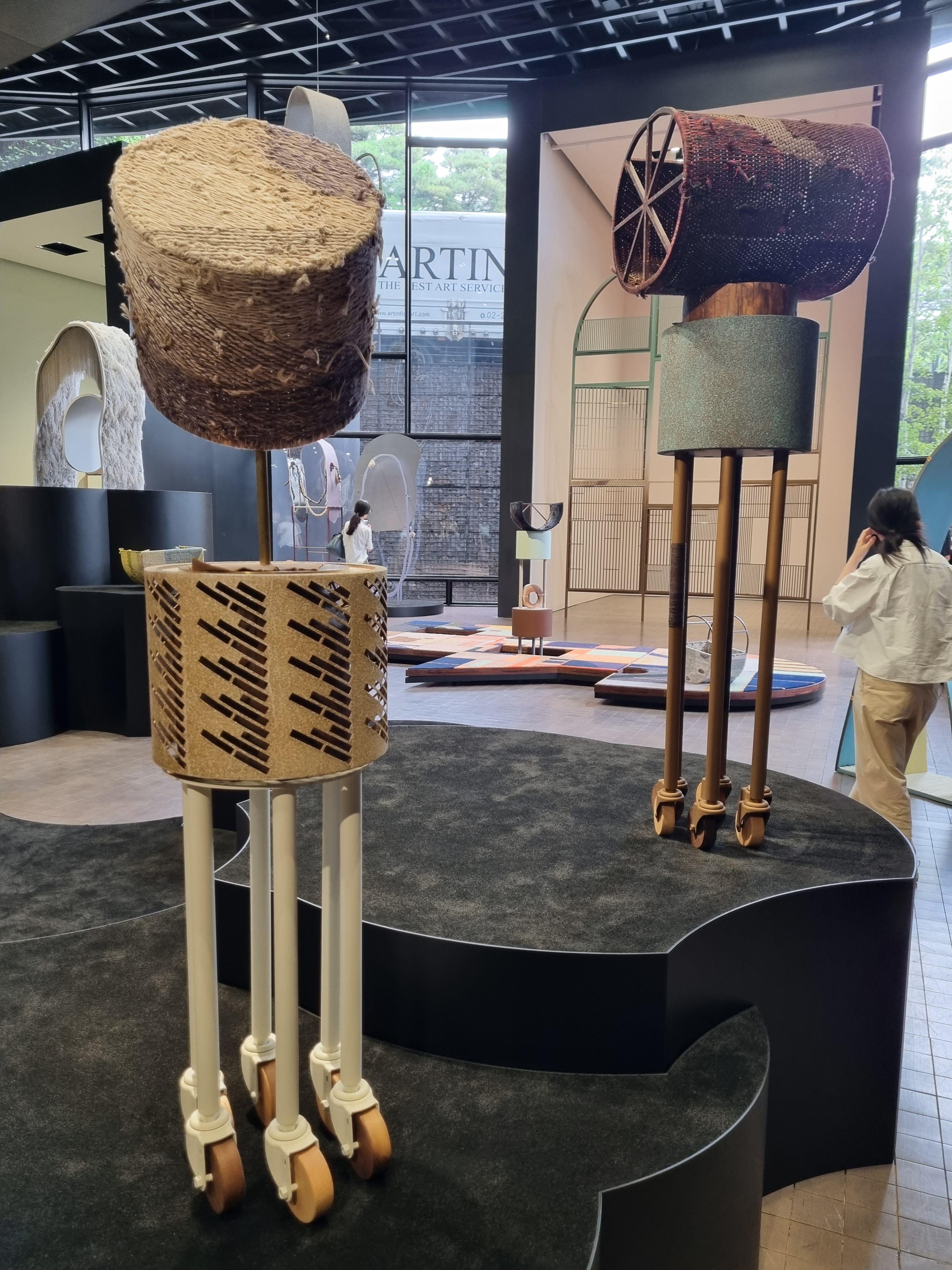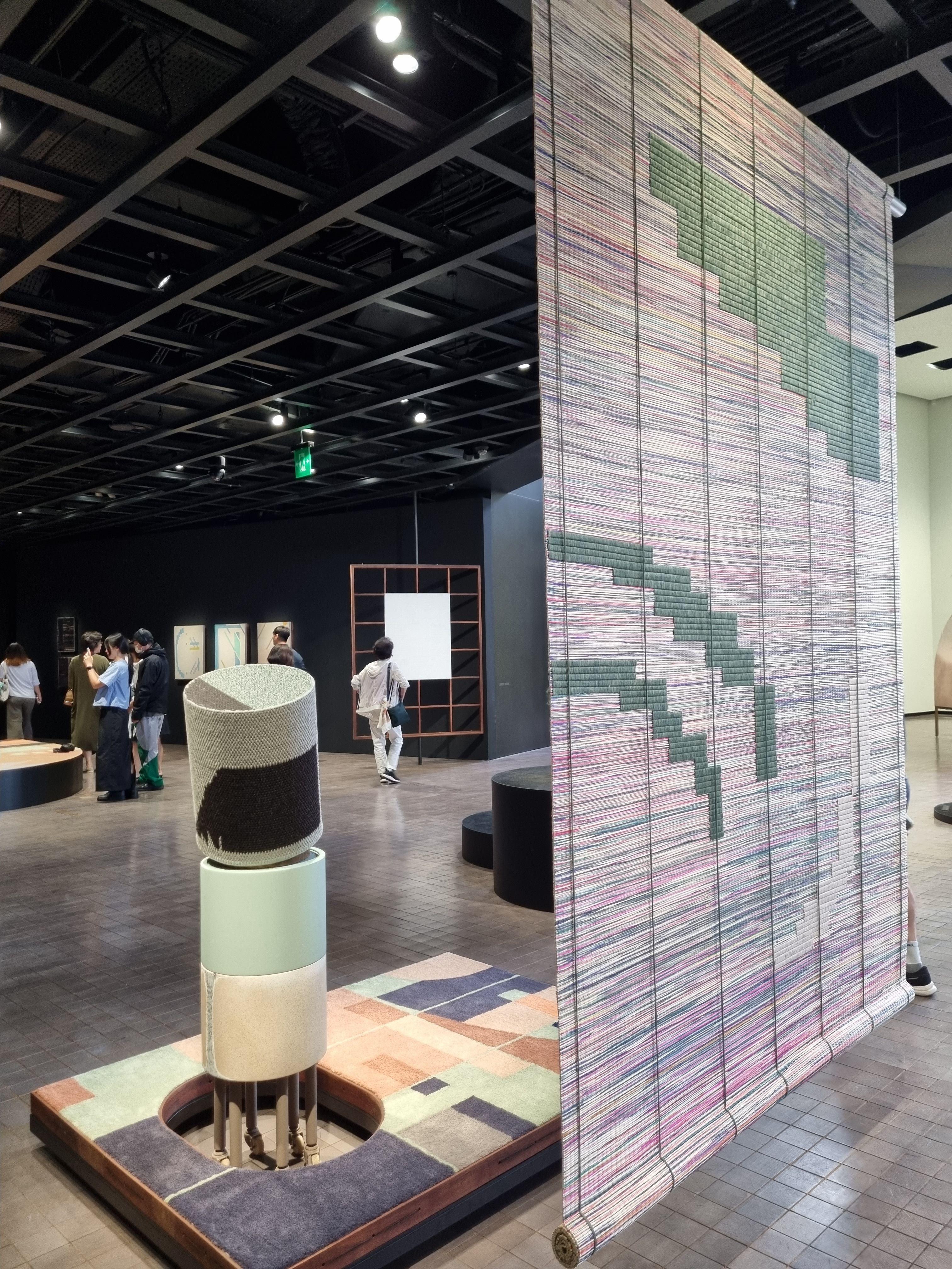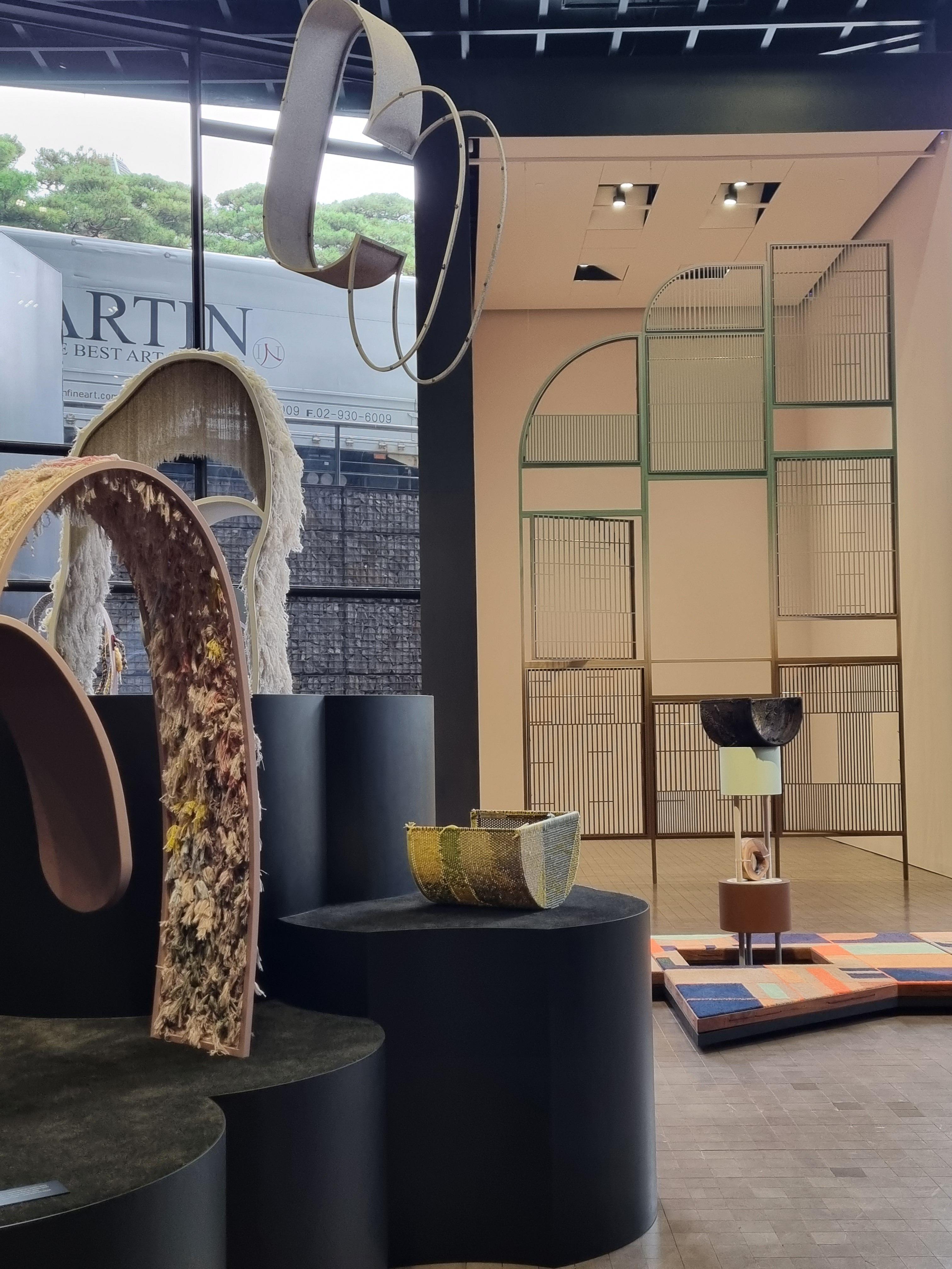 여기서 빼곡한 격자 구조와 리드미컬한 도형으로 구성된 금속 프레임은 다채로운 색상과 패턴의 화문석을 만나 시각적 레이어를 창출하기도 하며