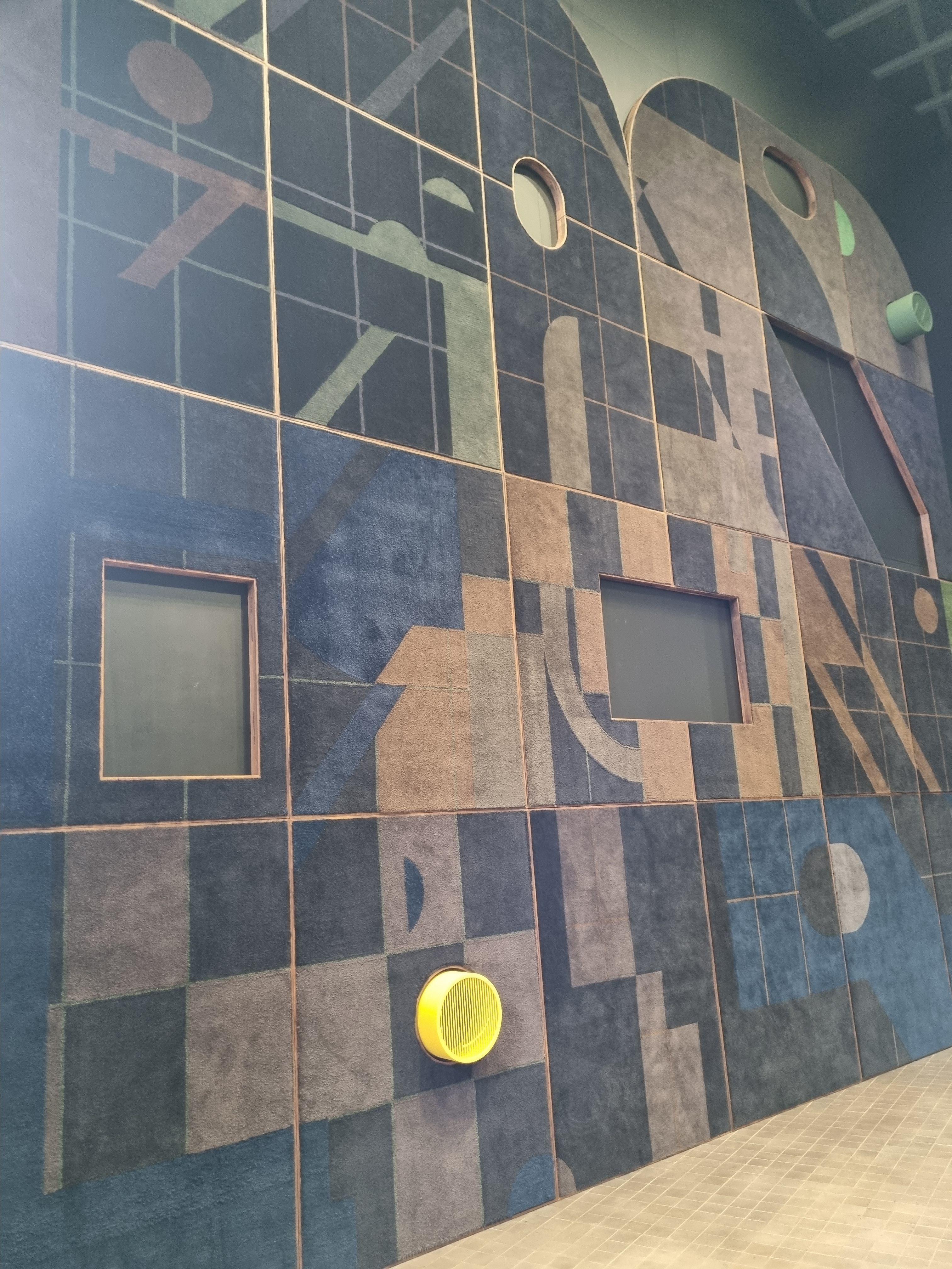 전시장 가운데 카펫처럼 전시되어 있는 <낮>작품 내부의 사각, 삼각, 원등의 기하학적 구조는 일정한 규칙에 의해 나눠져 있습니다.
