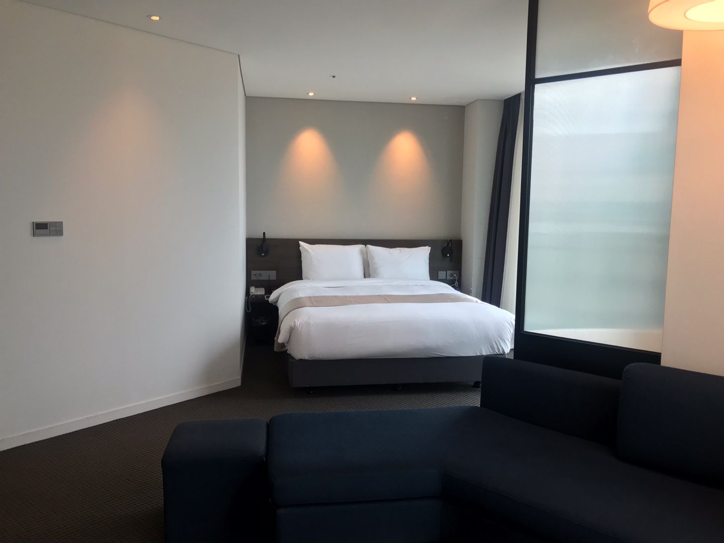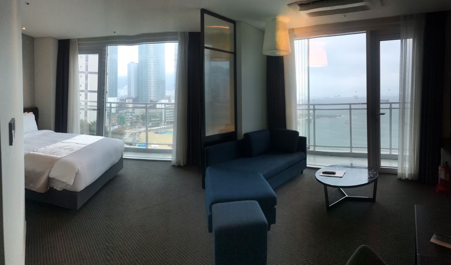 부산 그랩디오션 송도 주니어 스위트는 침대 하나와 거실이 같이 있는 독특한 구조입니다.