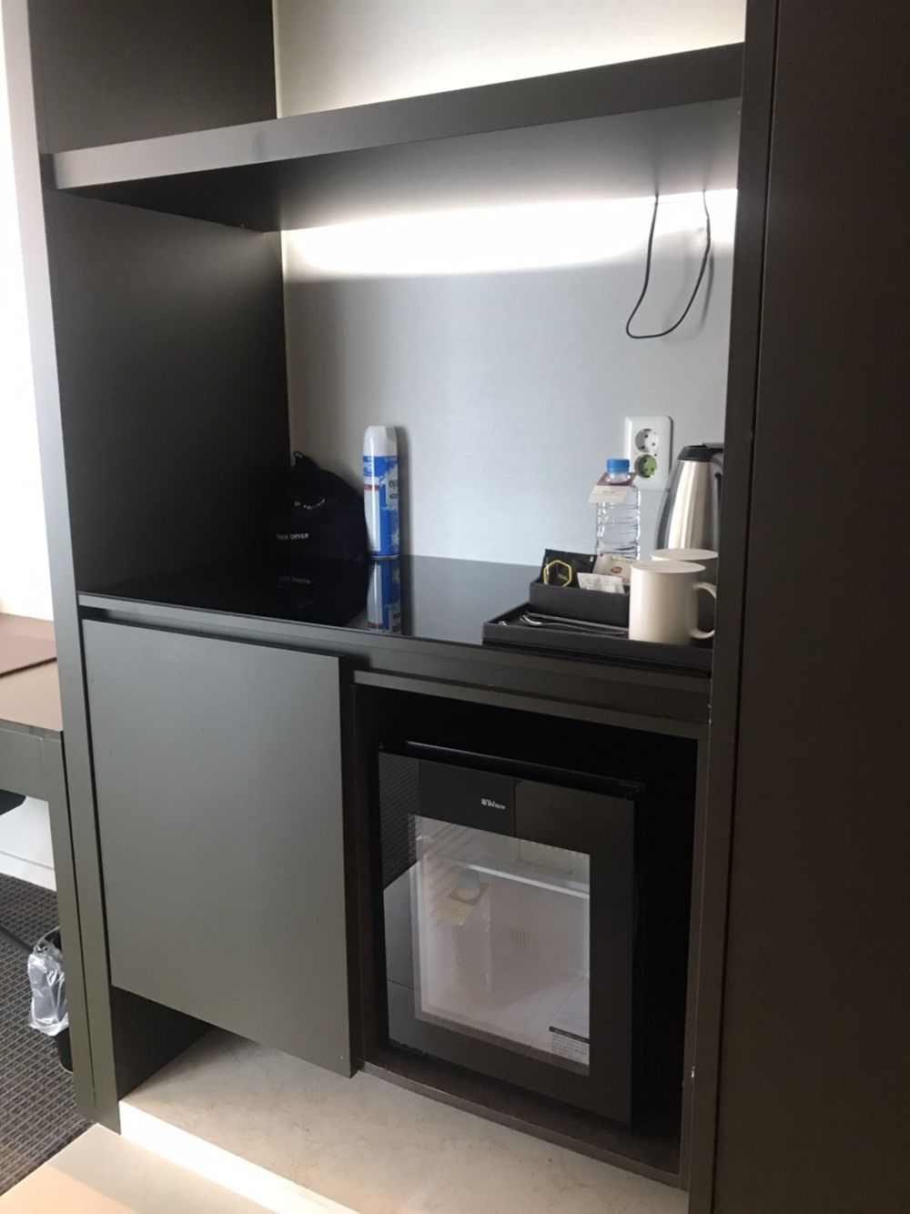 오른쪽으로 냉장고와 커피포트 등이 있고