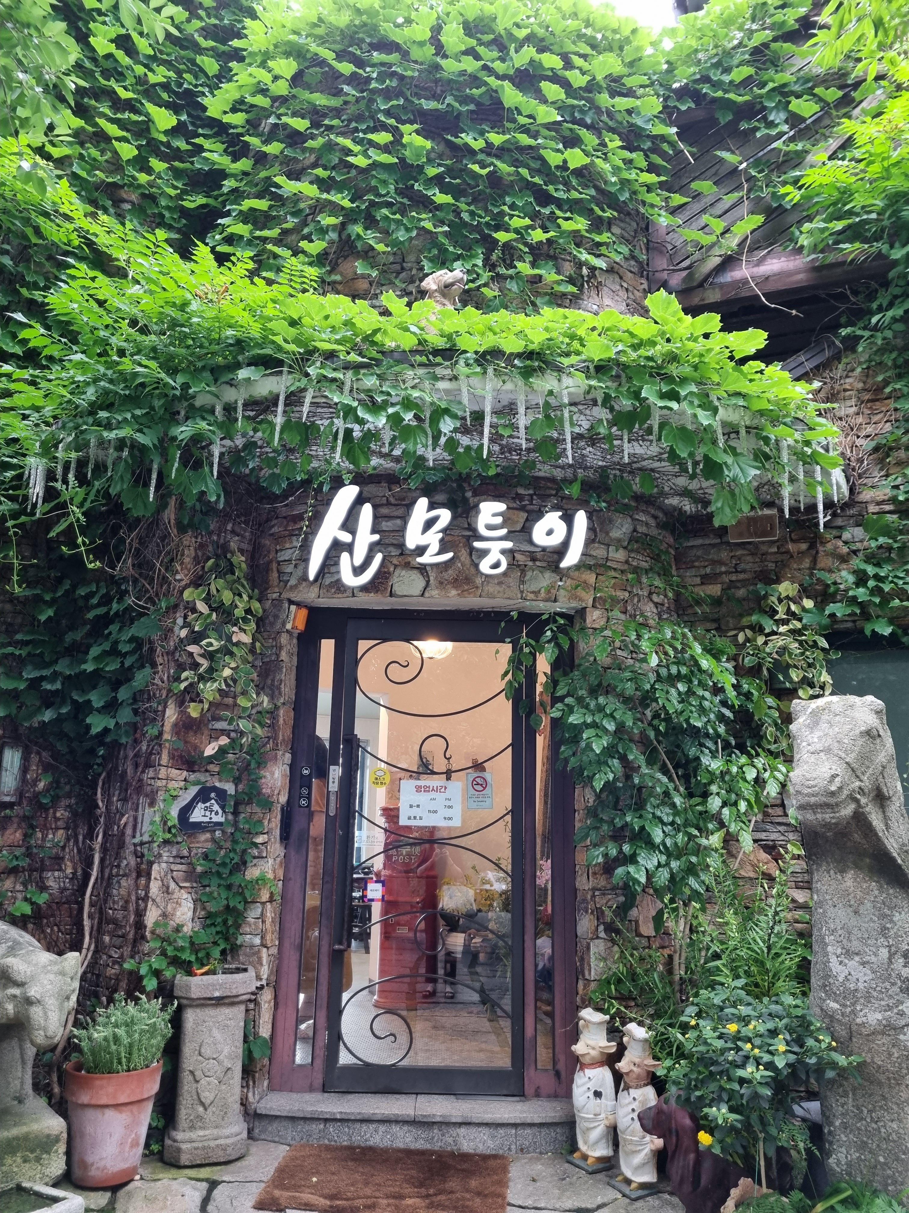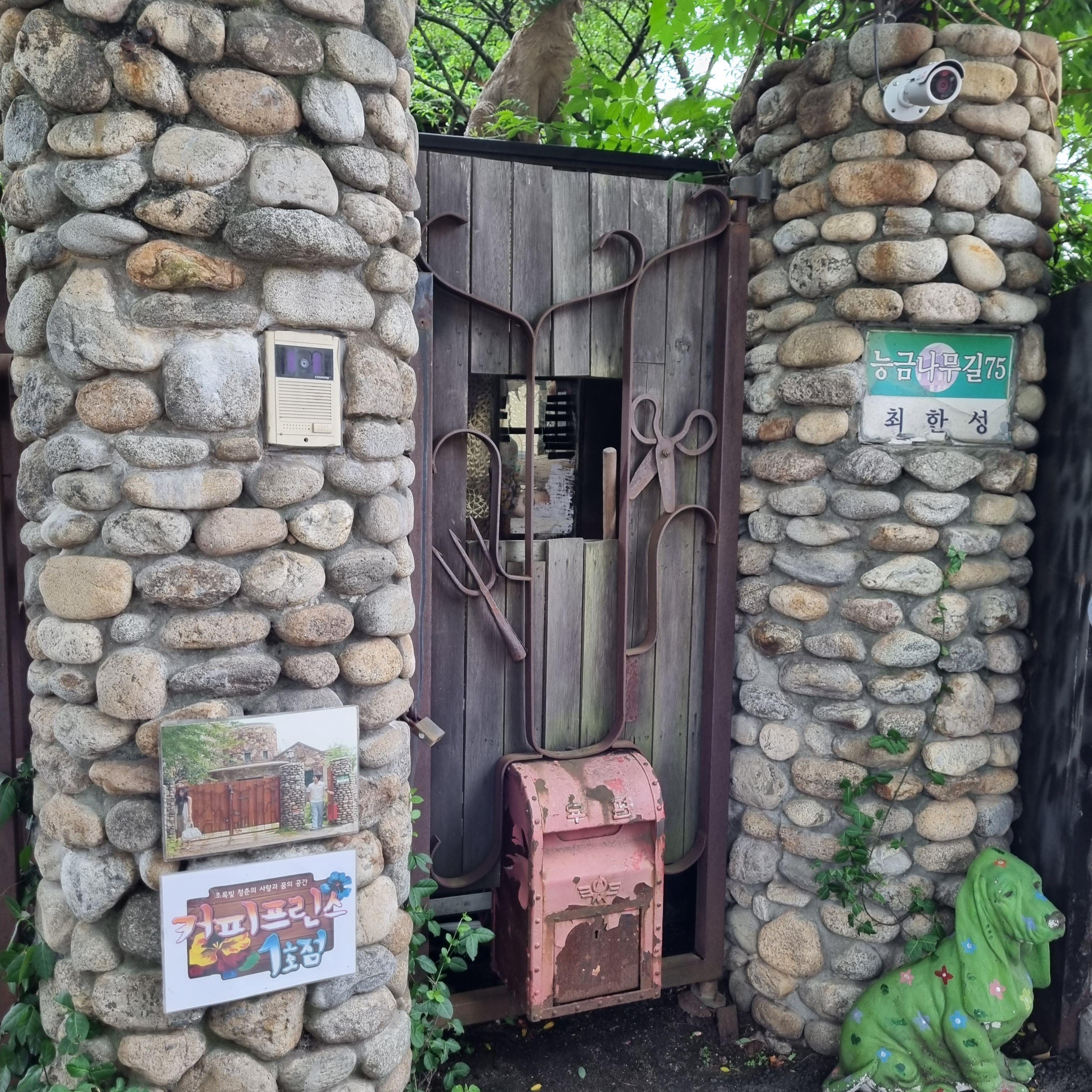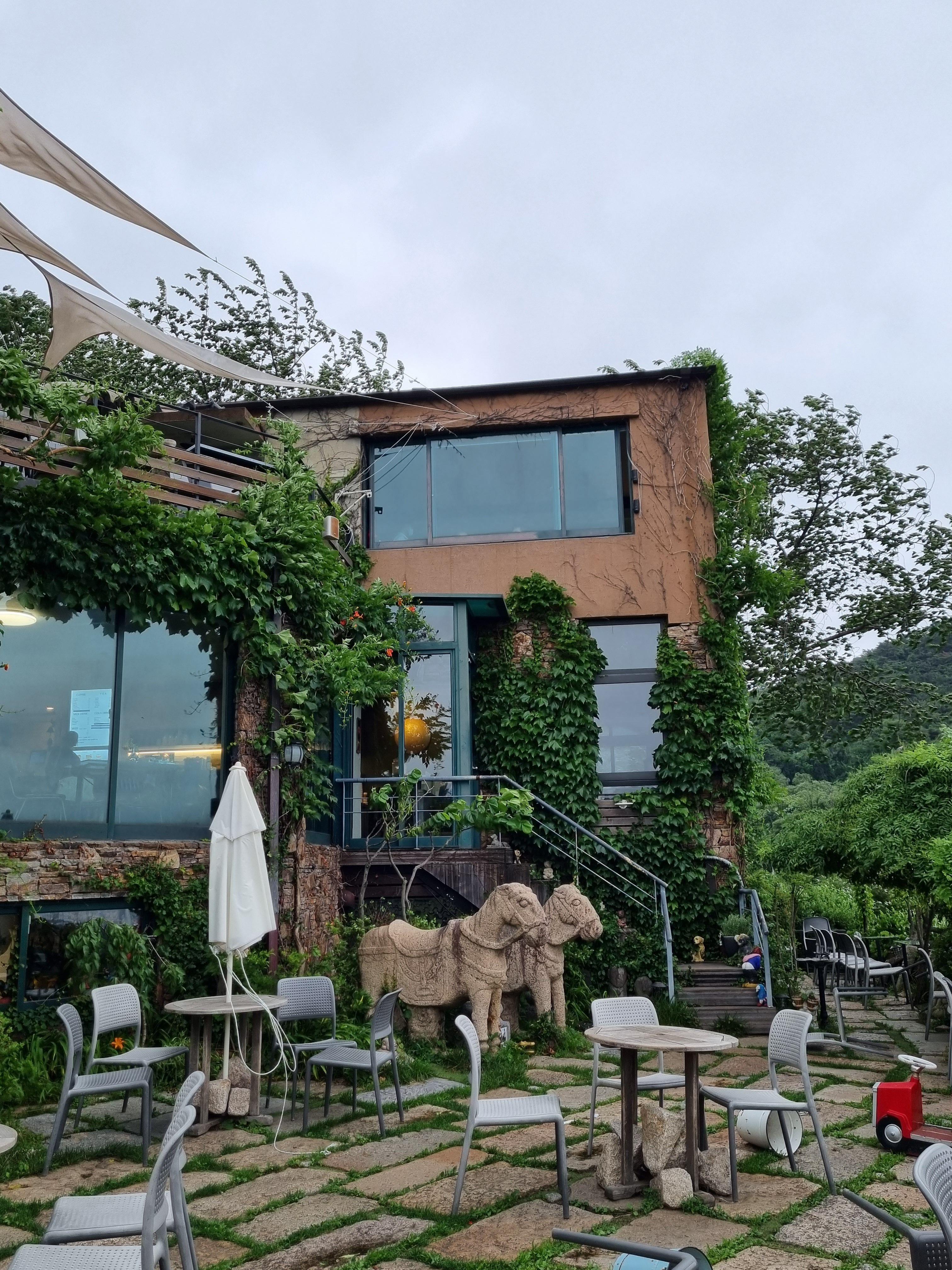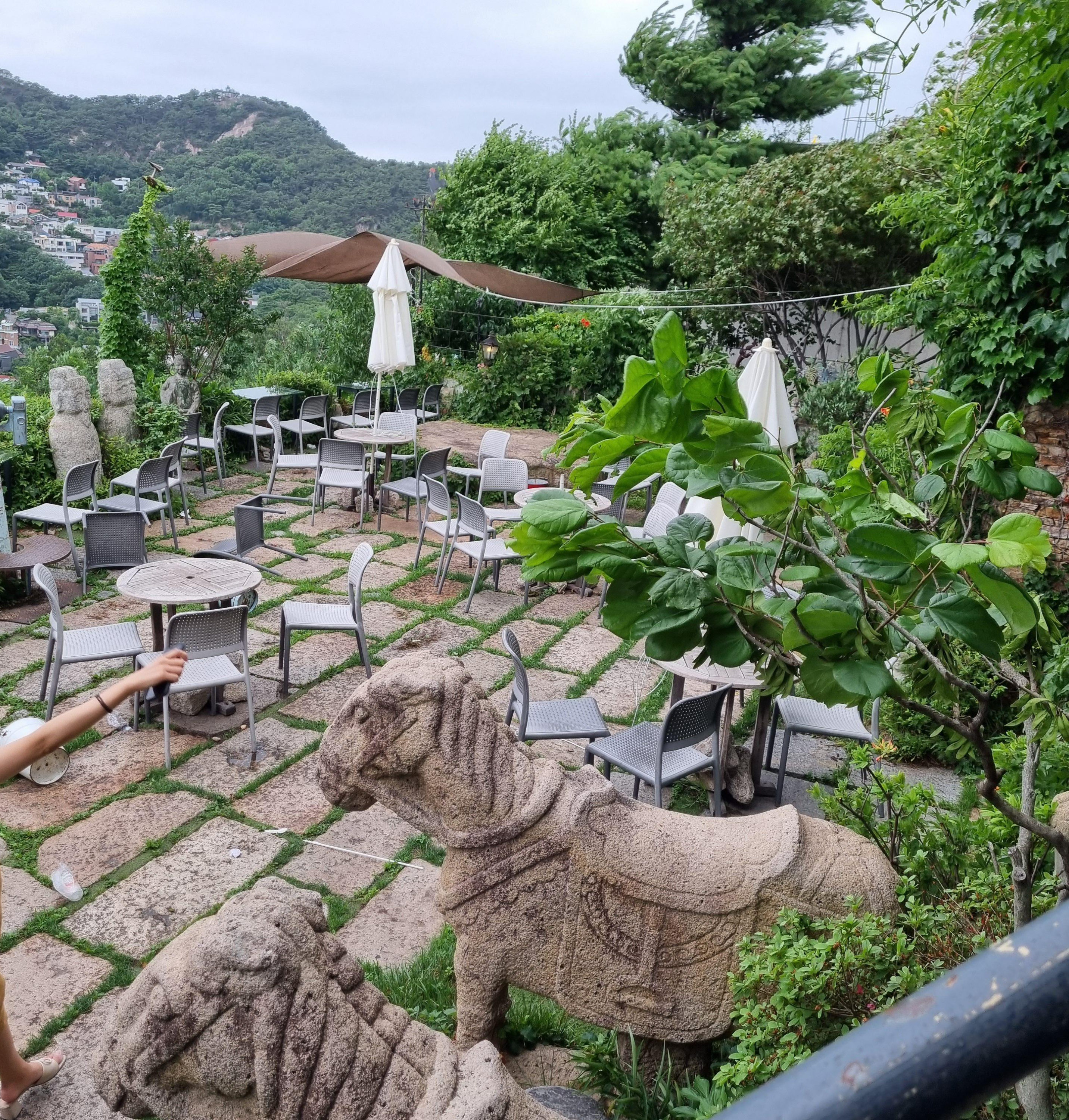 다양한 모양의 석상들과 바닥의 돌, 우거지게 자란 나무들과 풀이 세월을 말해주지만,, 그또한 이 산모퉁이카페의 매력이었어요. 왠지 어디 유럽같은 곳에 있는 것 같은 느낌이 들었다고 해야하나요~?