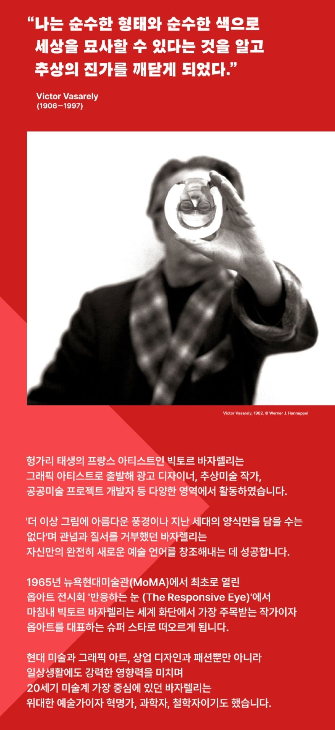 상업광고 디자이너로 시작해 추상미술, 키네틱 아트를 거쳐 옵아트로 세계 미술의 중심이 된 빅토르 바자렐리 평생의 예술 여정을 한자리에서 만날 수 있는 기회라고 하니 기대가 됩니다.
