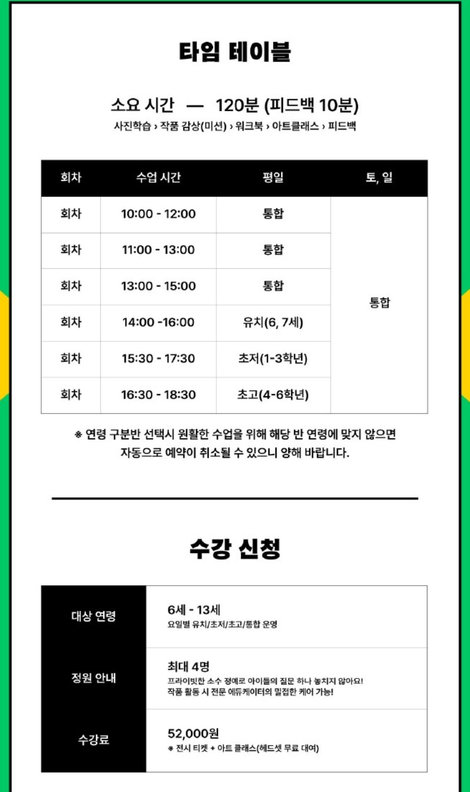 아래 타임테이블을 보면 소요 시간은 120분으로, 대상 연령은 6세부터 13세입니다.