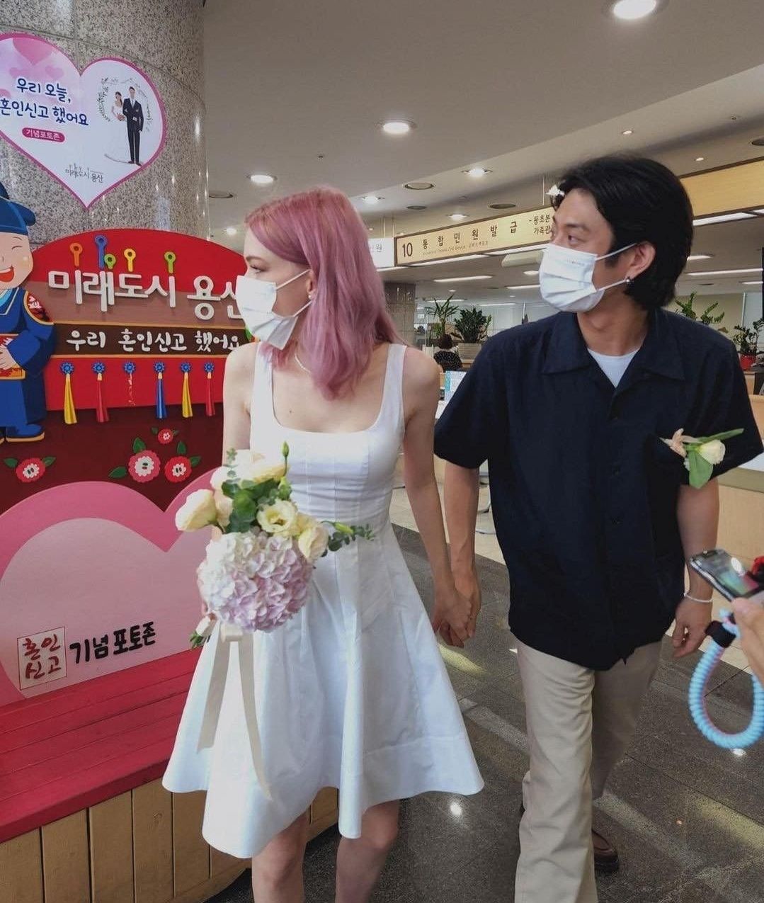 혼인신고를 마치고 혼인신고 포토존에서 촬영한 사진도 올라왔는데요, 여느 신혼부부와 다를바 없는 풋풋한 분위기를 풍겼어요.