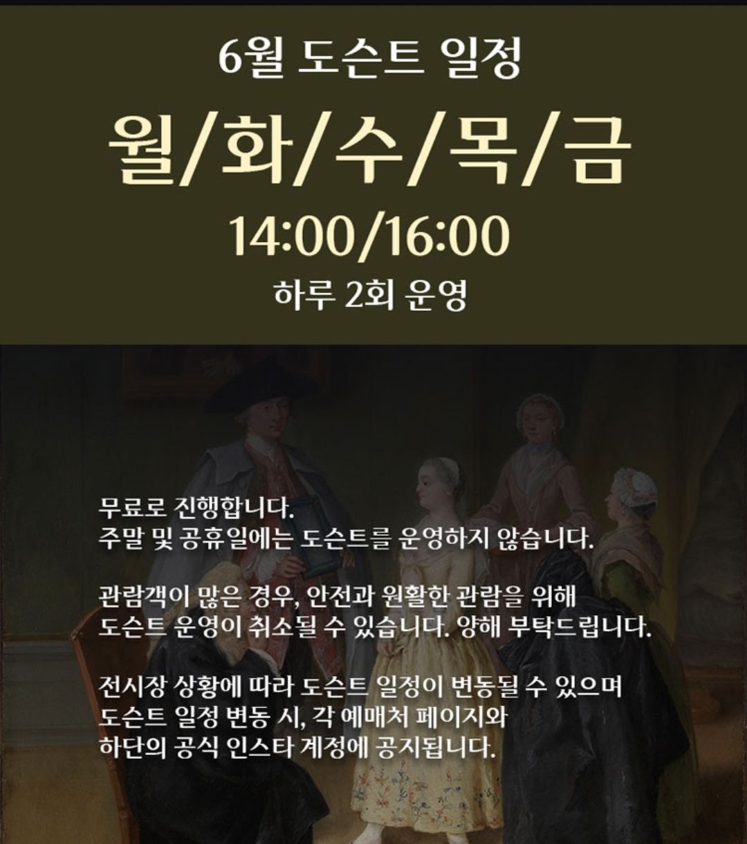 주말 및 공휴일에는 도슨트를 운영하지 않고 전시장 상황에 따라 도슨트 일정이 변동될 수 있다고 하니 참고하세요.