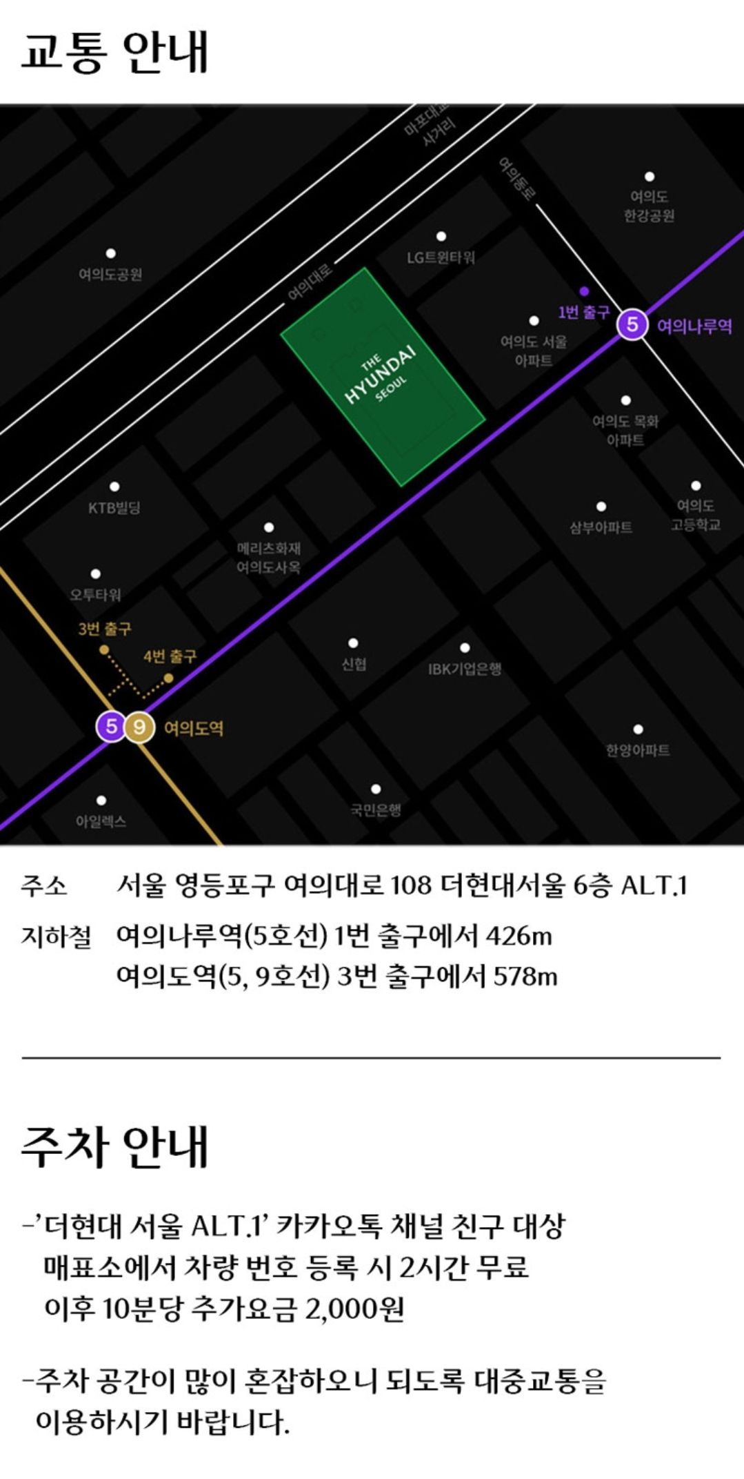 주차는 더현대서울 ALT.1 카카오톡 채널 친구 대상으로 매표소에서 차량 번호 등록 후 2시간 무료 지원됩니다.