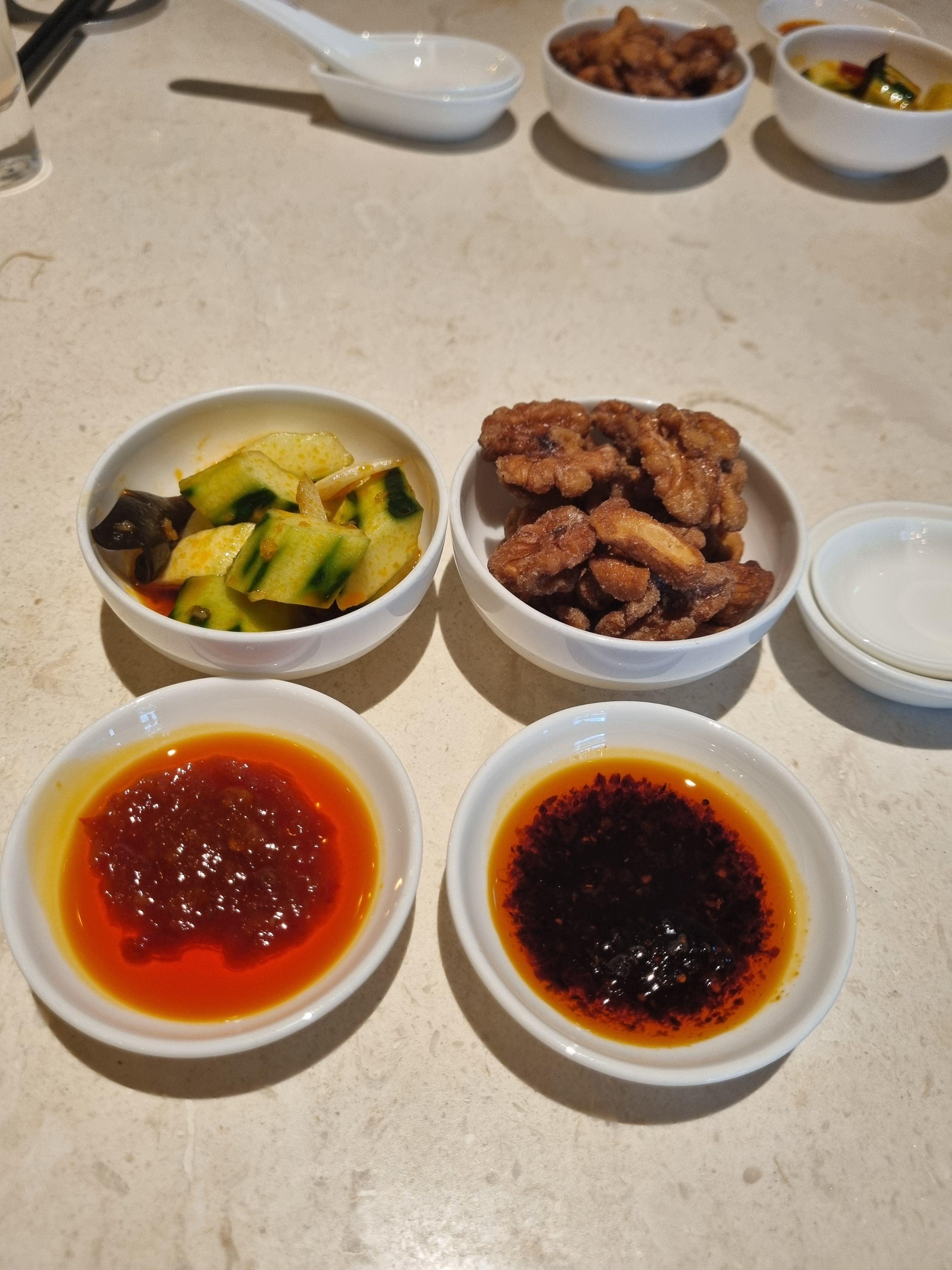 곁들여 나오는 소스들과 오이무침, 호두를 튀긴 반찬이 나왔는데 오이무침 계속 손이 가더라구요.