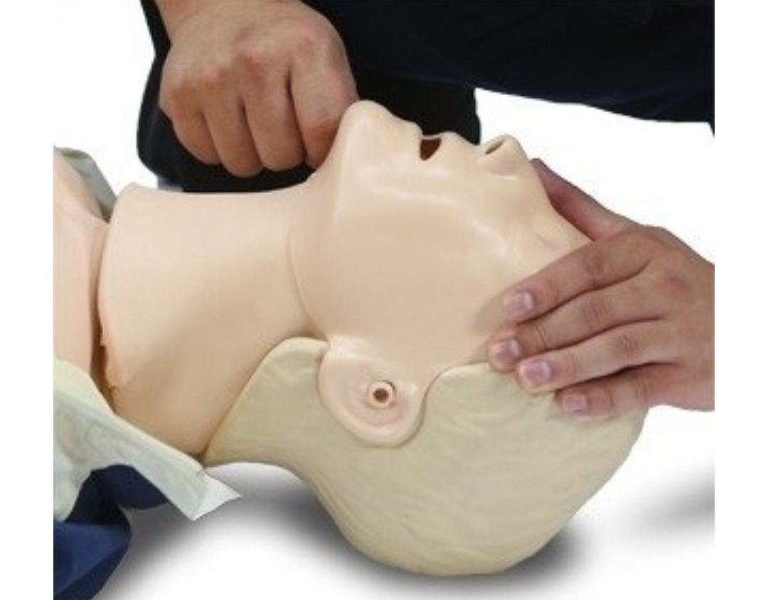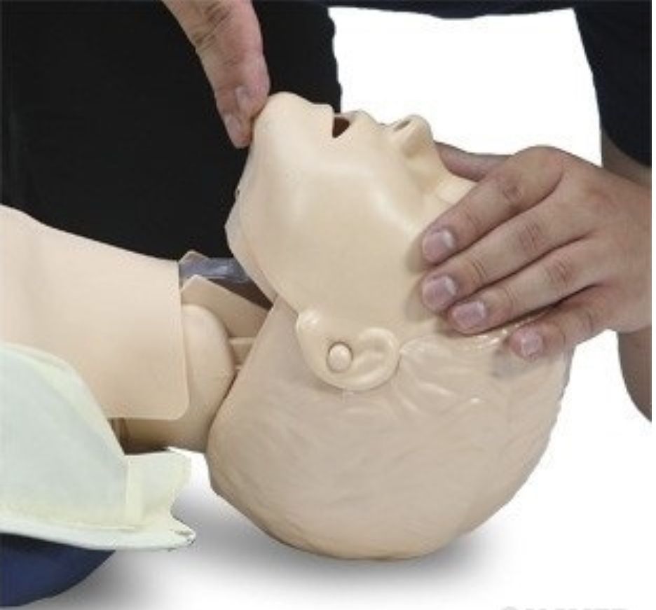 한 손으로 턱을 들어 올리고, 다른 손으로 머리를 뒤로 젖혀 기도를 개방시킵니다.