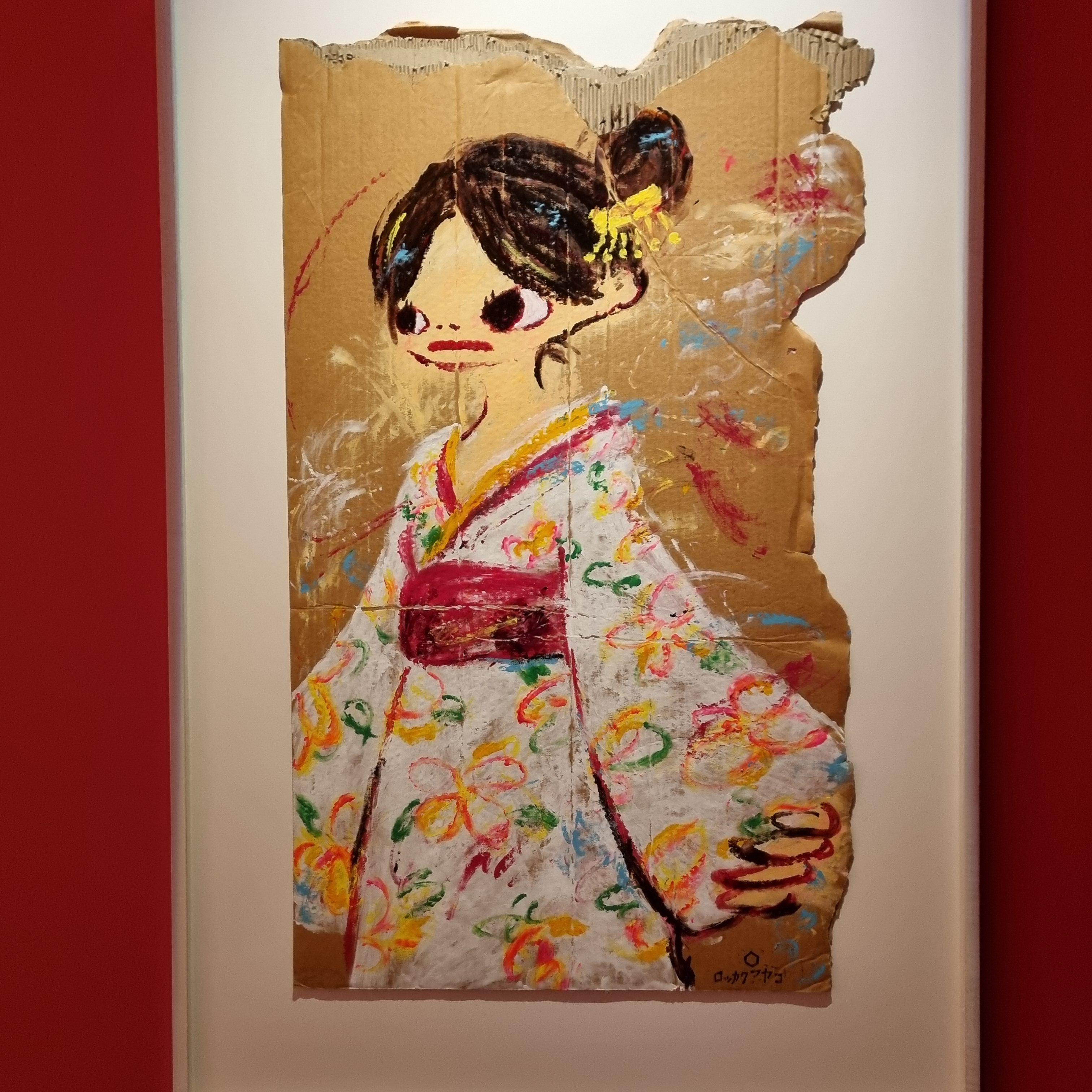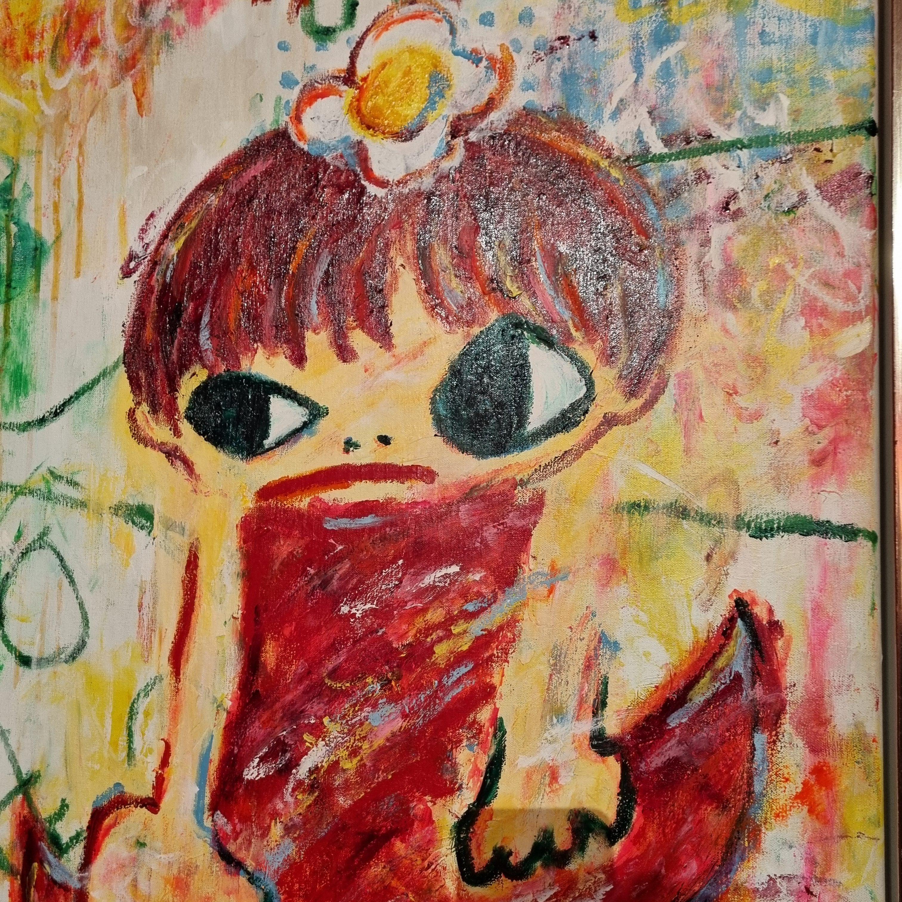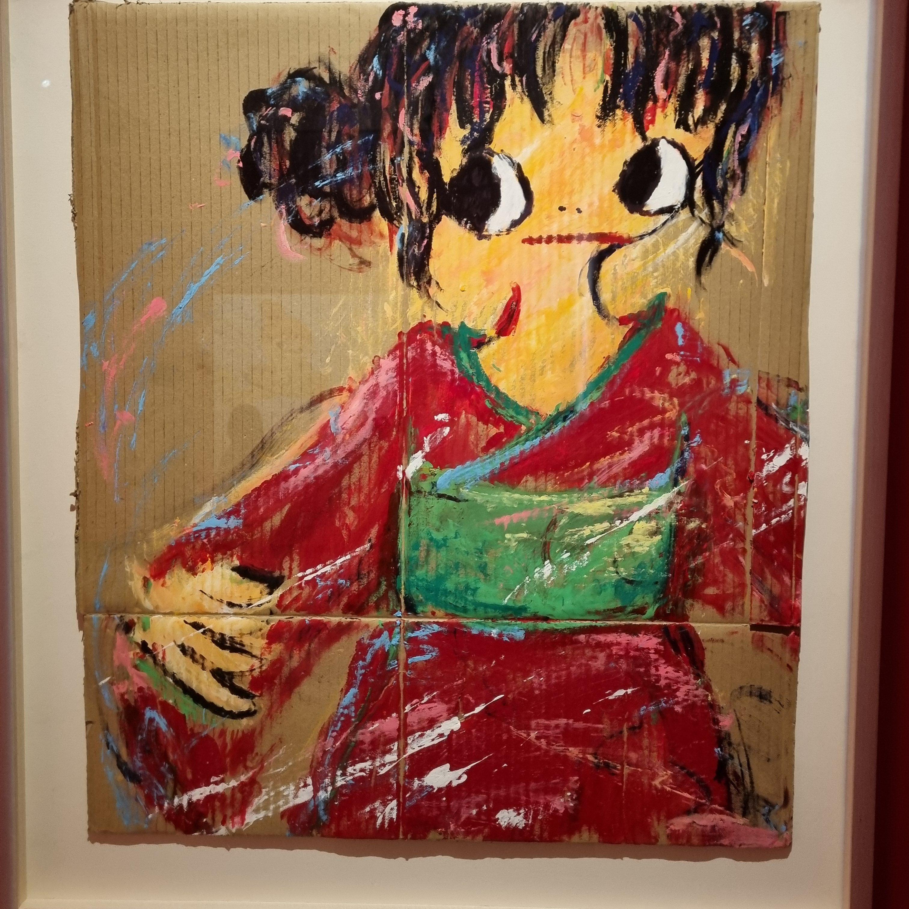 거칠게 찢은 골판지 위에 큰 눈의 소녀들과 생동감이 느껴지는 화려한 색채들.