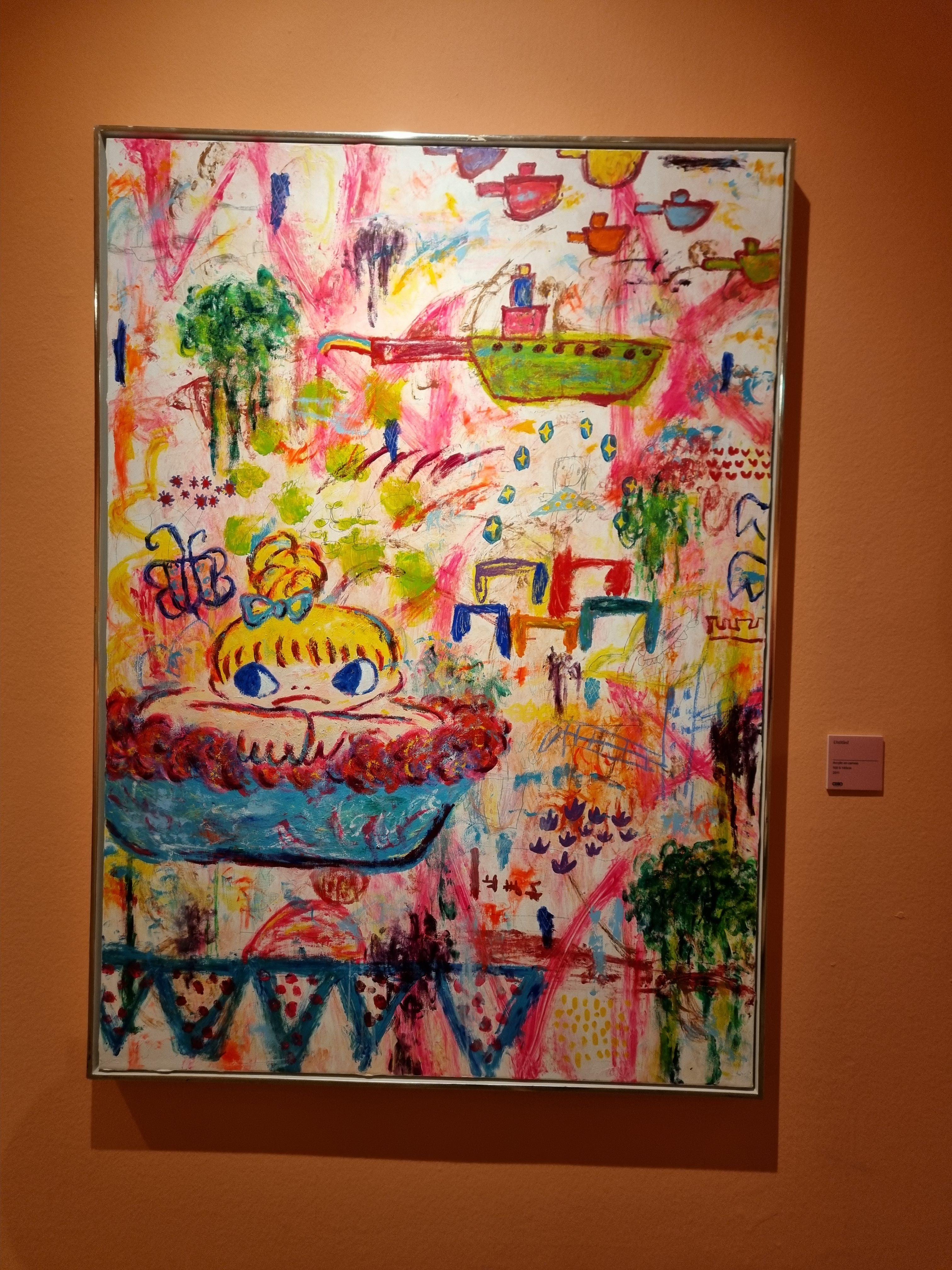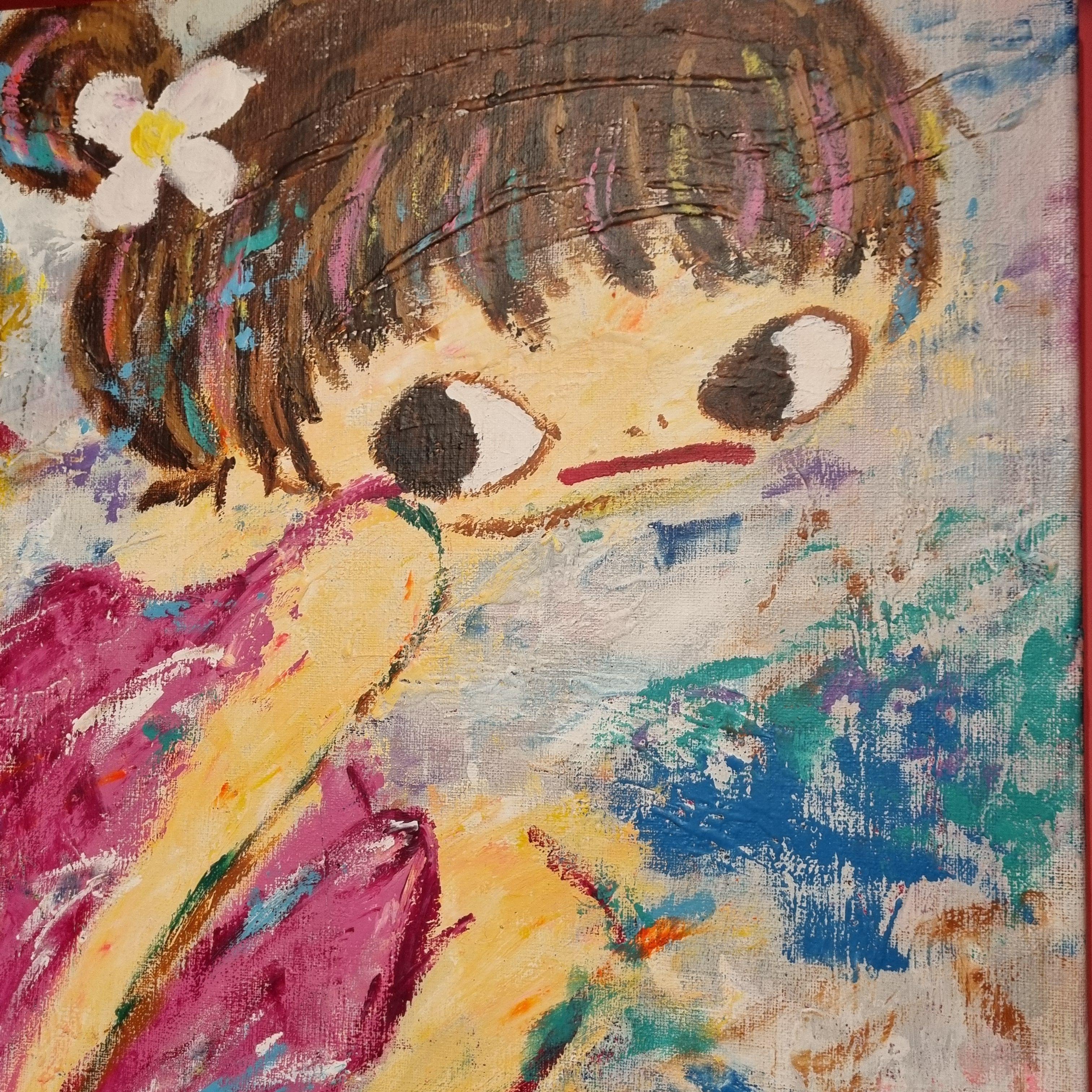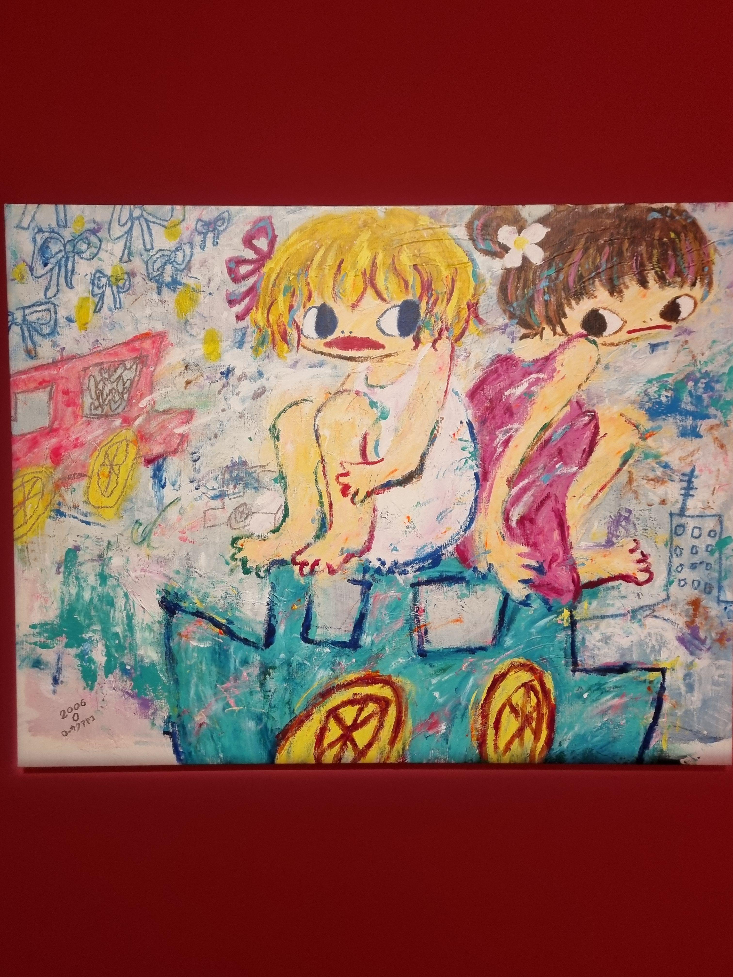 거칠게 찢은 골판지 위에 큰 눈의 소녀들과 생동감이 느껴지는 화려한 색채들.