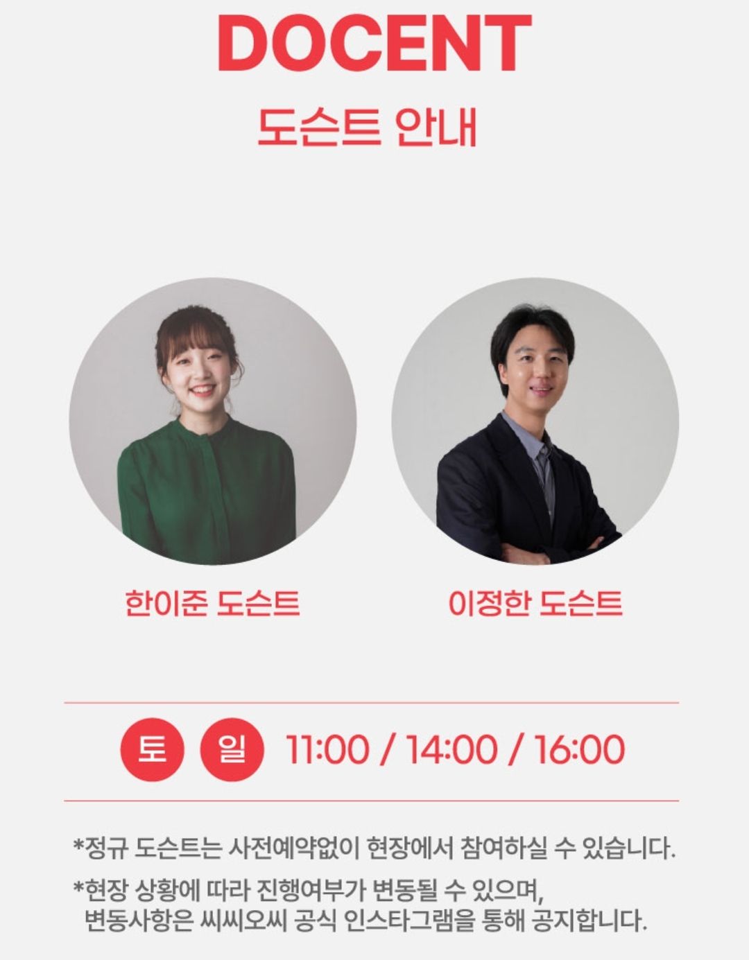 도슨트는 한이준 도슨트, 이정한 도슨트이며 토,일 11:00/ 14:00/ 16:00 입니다.