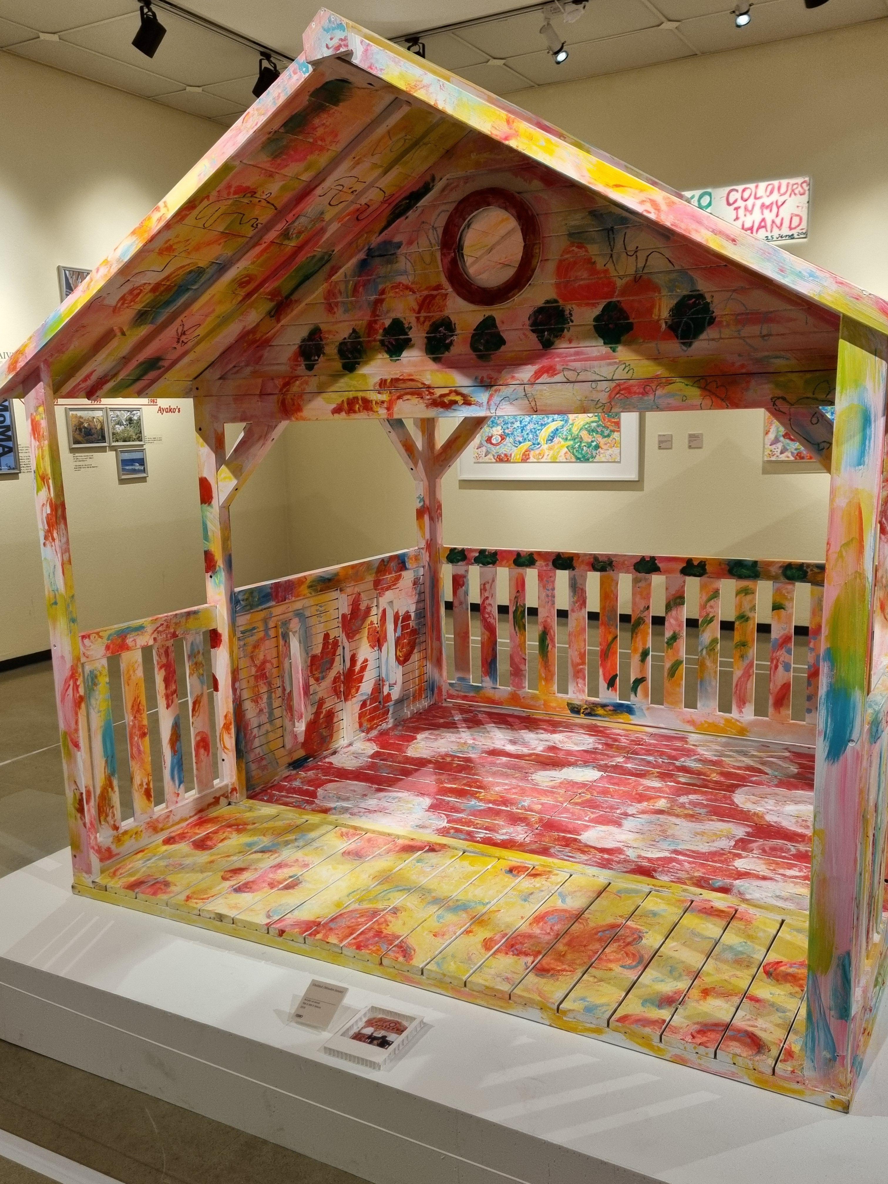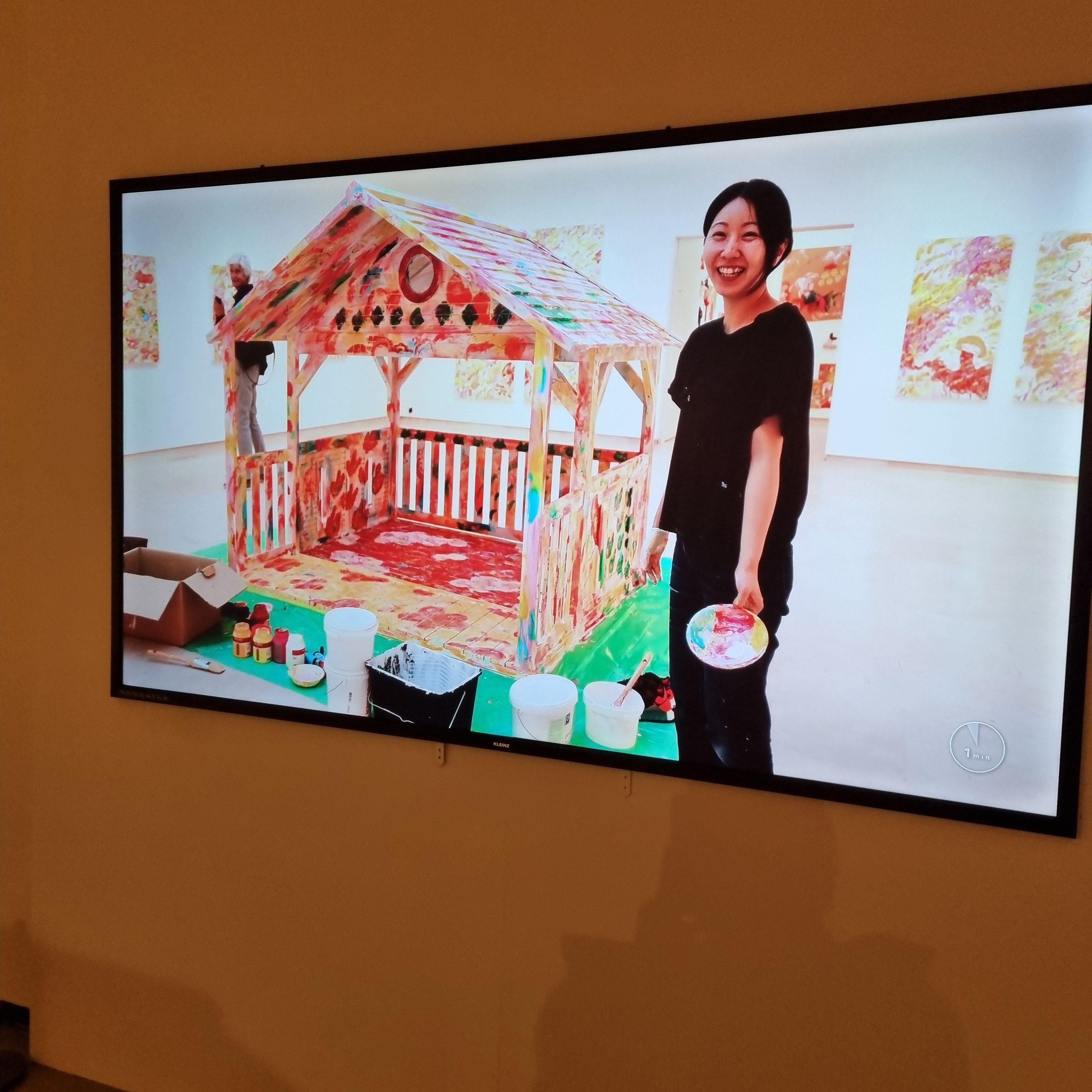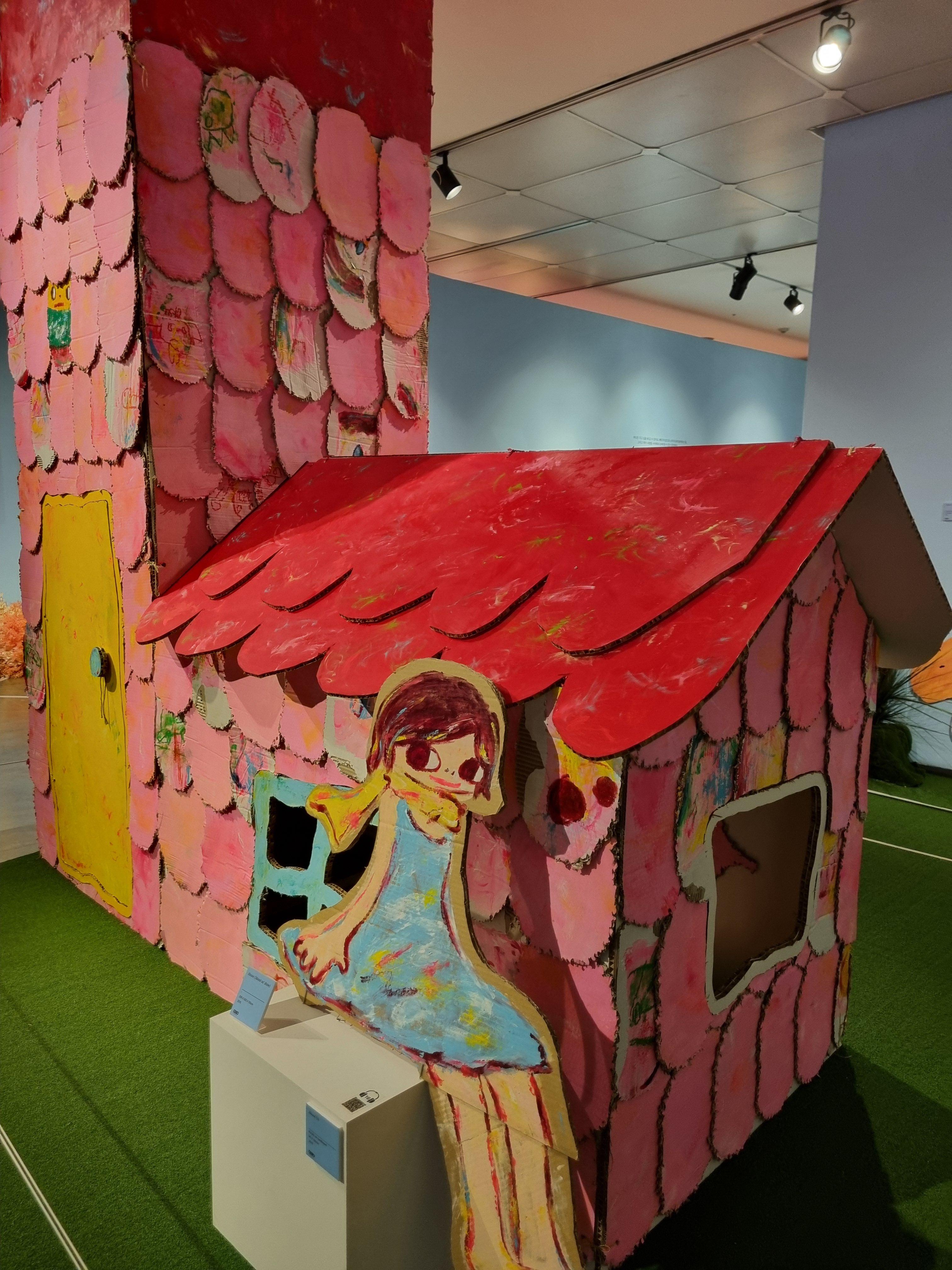 골판지 위에 분홍 벽돌을 그리고 빨간 지붕을 칠해 인형의 집을 만드는 라이브 퍼포먼스를 선보였습니다.