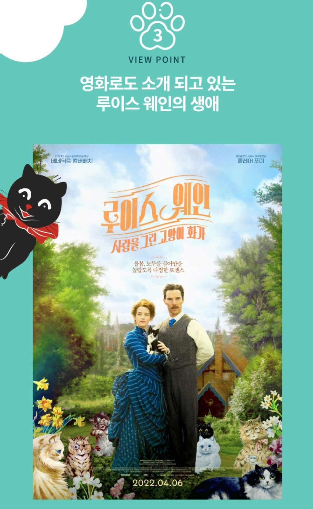동물들과 강아지를 주로 그리던 루이스 웨인은 사랑하는 아내를 암으로 떠나보내기전 그녀가 사랑하던 고양이 피터를 주로 그렸는데, 런던뉴스 크리스마스 특집호에 그의 고양이 그림이 실리면서 하루아침에 유명세를 얻게 되었다고 합니다.