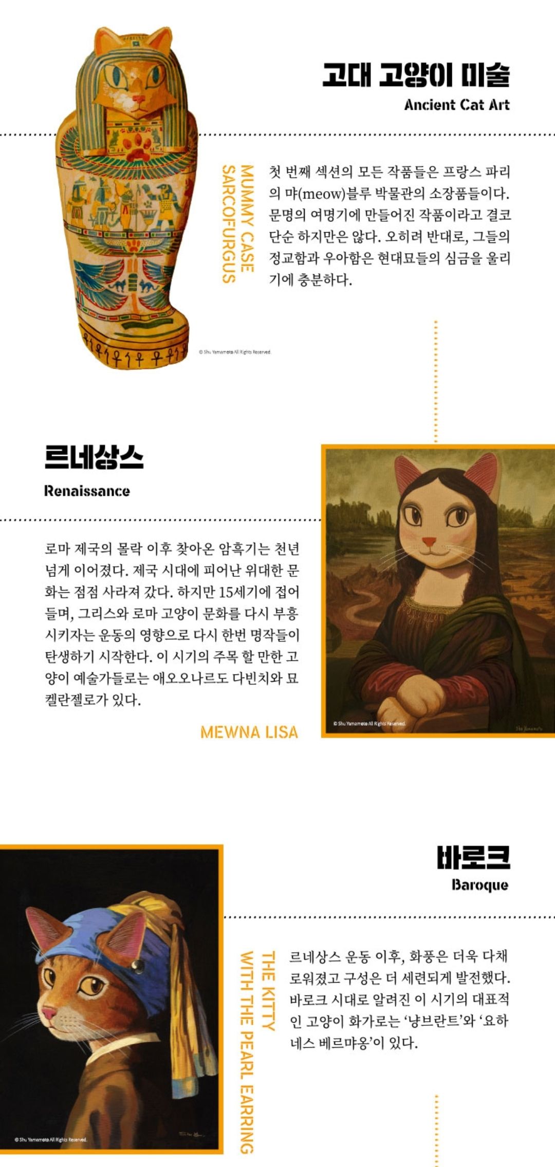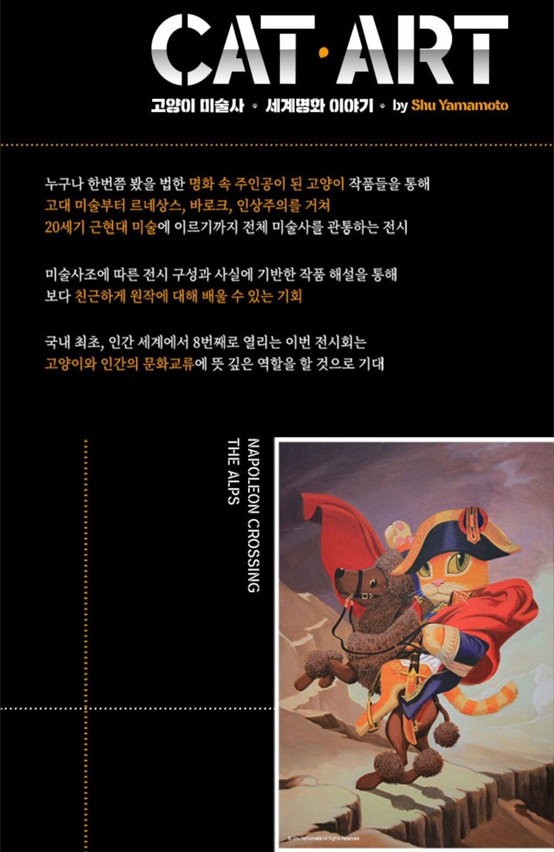 < CAT ART : 고양이미술사>전시는 누구나 한번쯤 봤을법한 명화 속 주인공이 된 고양이 작품들을 통해 고대 미술부터 르네상스, 바로크, 인상주의를 거쳐 20세기 근현대 미술에 이르기까지 전체 미술사를 관통하는 전시입니다.