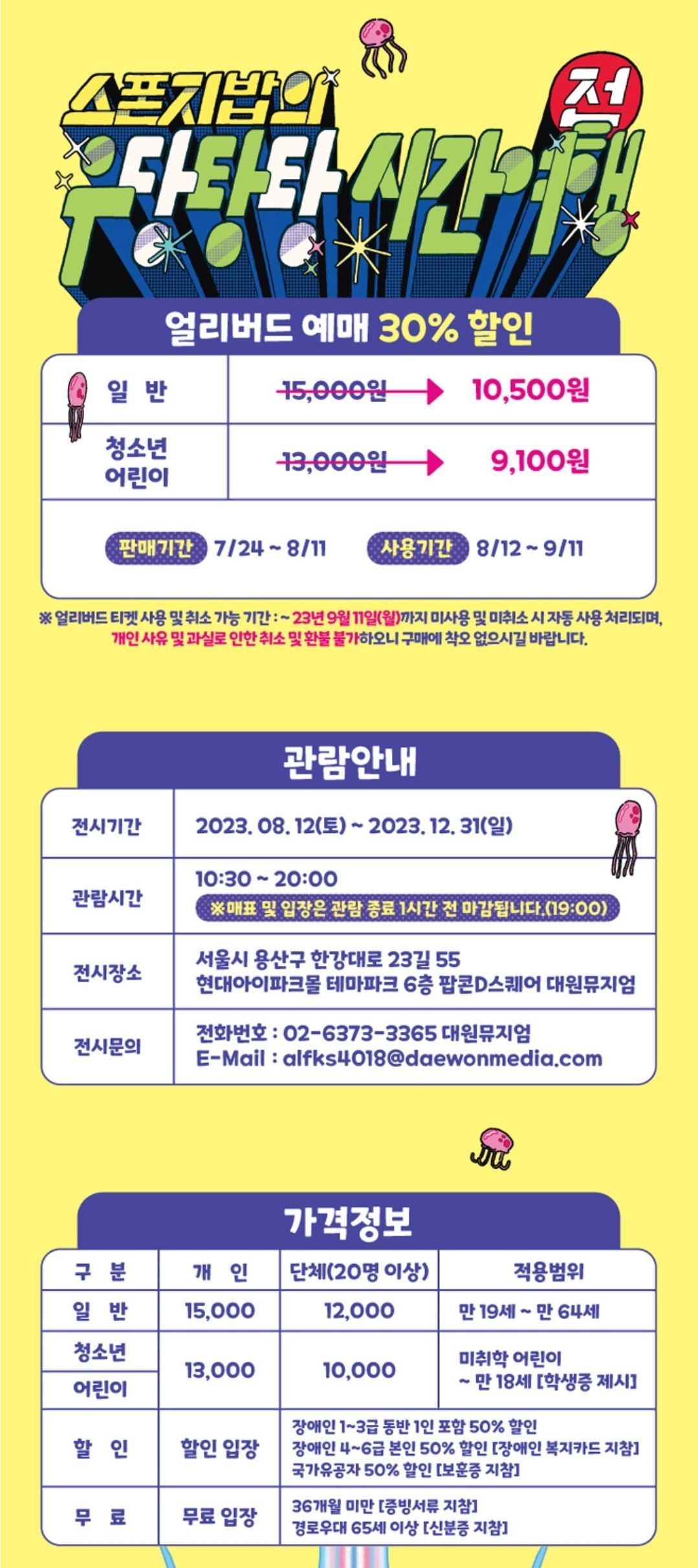 아이들이 정말 좋아하는 스폰지밥의 전시가 8월 12일부터 용산 아이파크몰 대원뮤지엄에서 시작됩니다.