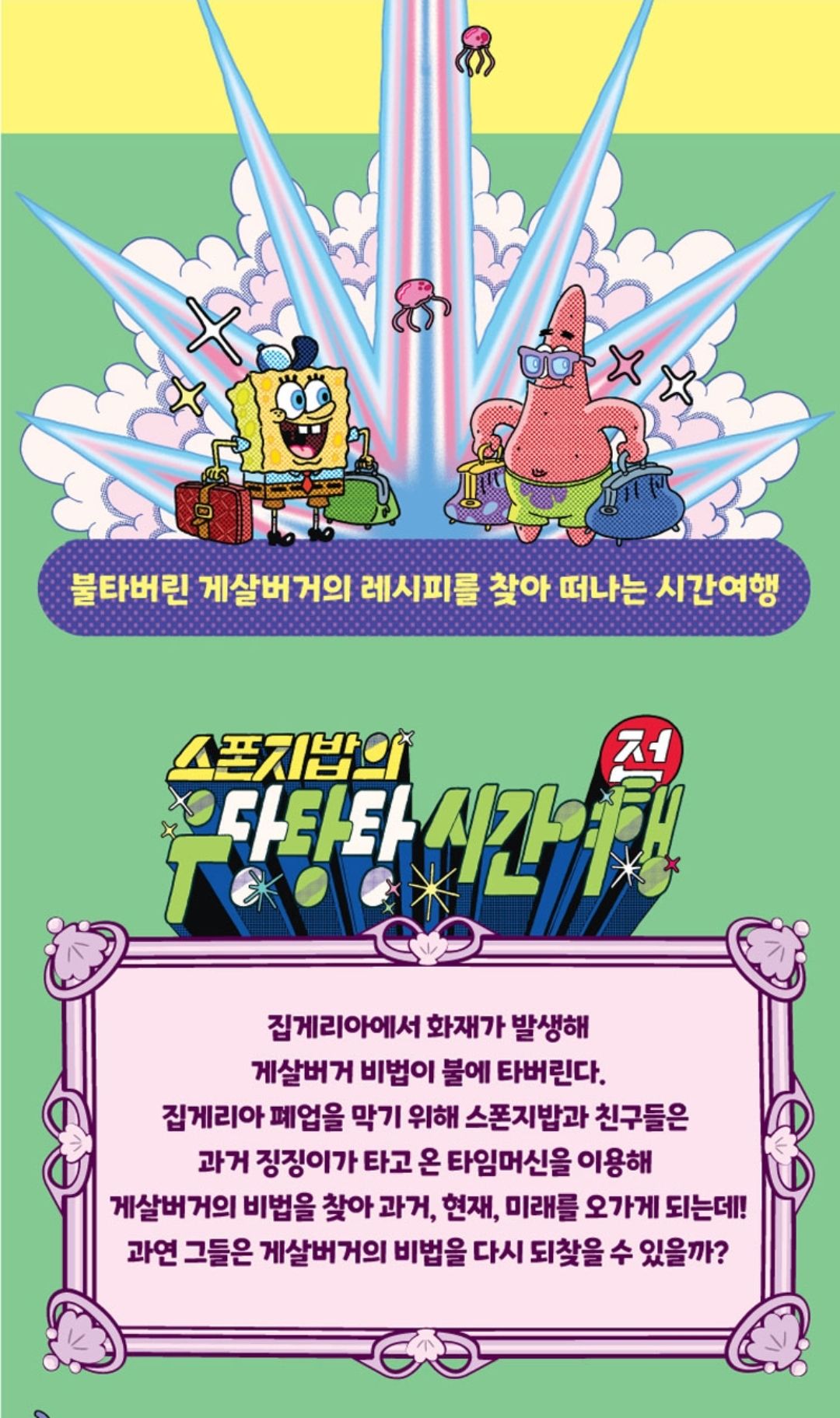 집게리아 폐업을 막기 위해 스폰지밥과 친구들은 과거 징징이가 타고온 타임머신을 이용해 게살버거의 비법을 찾아 과거, 현재, 미래를 오가게 되는 우당탕탕 시간여행을 하는 스토리입니다.