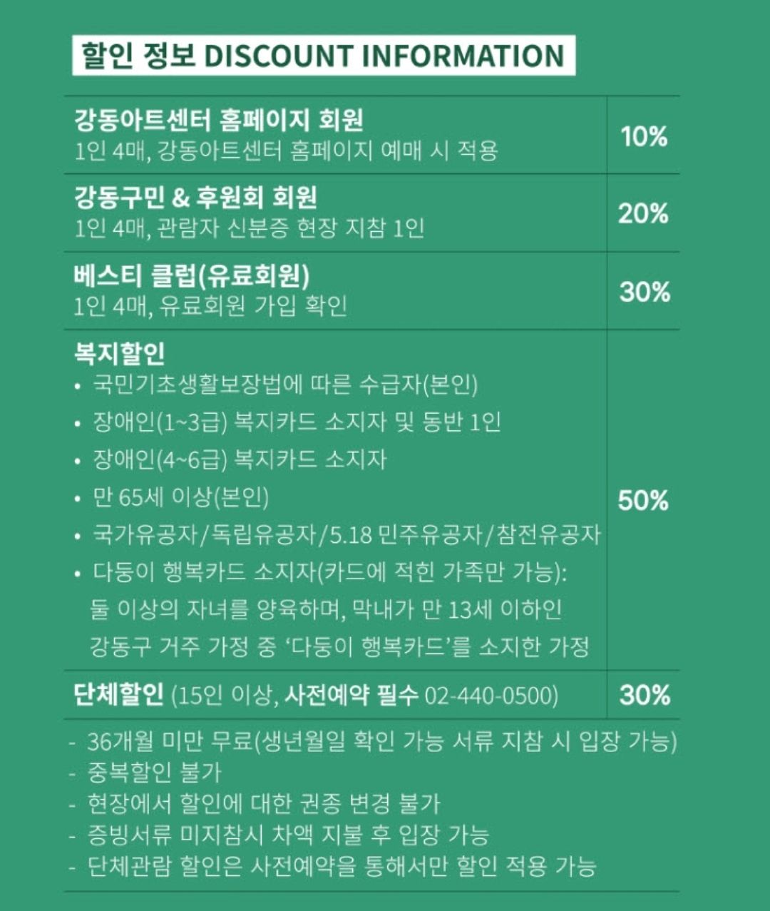 강동아트센터 홈페이지 회원은 관람요금이 10% 할인되니까 예매하시기 전에 가입하시면 좋겠네요.