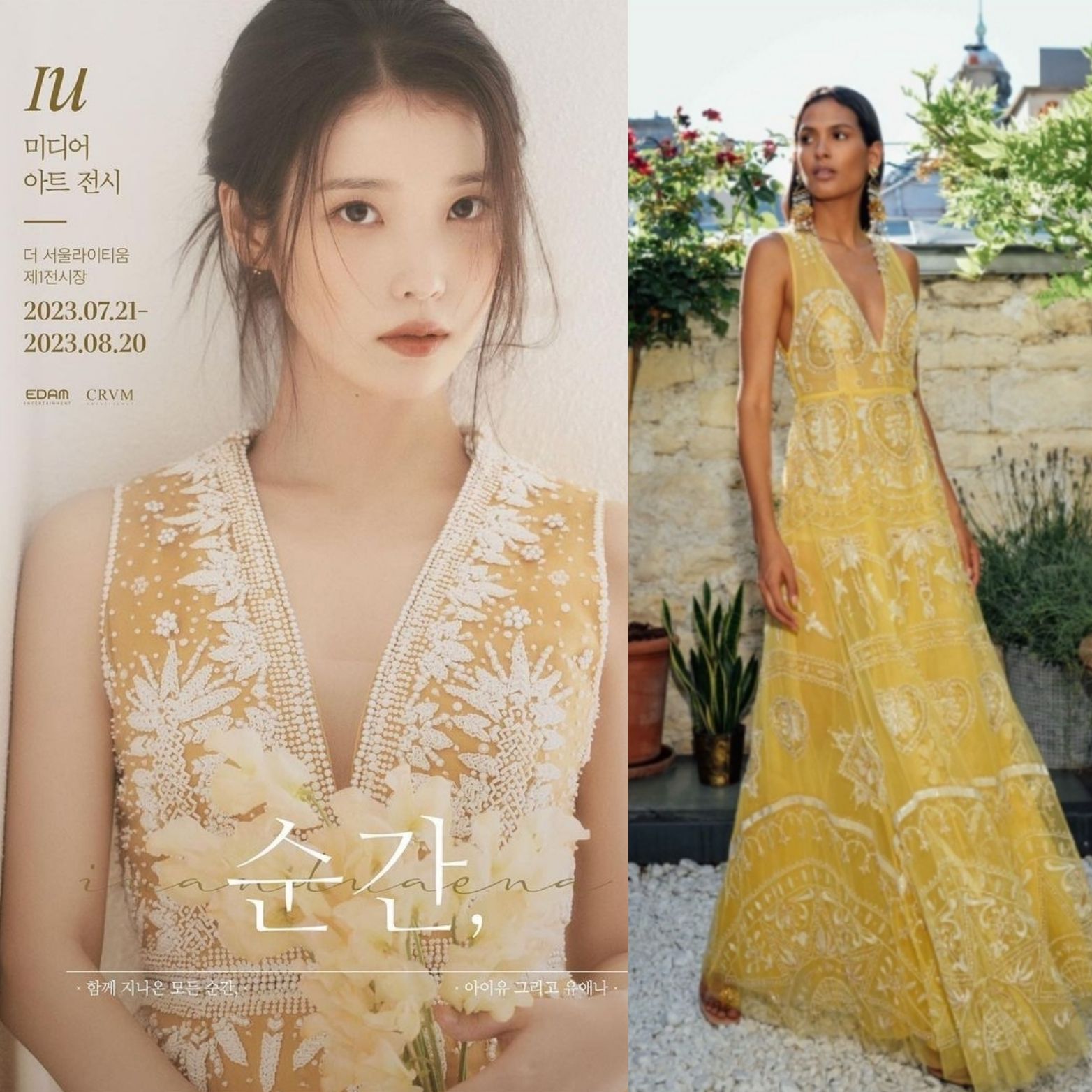 이번 15주년 전시회의 포스터에 아이유는 노란드레스에 화이트 자수와 화이트 비즈가 장식된 디자인을 입었는데 그녀의 이미지와 참 잘 어울렸습니다.